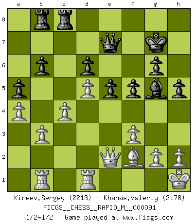 Last move : 1/2-1/2 2018 January 20 21:1:16 [Event "FICGS__CHESS__RAPID_M__000091"] [Site "FICGS"] [Date "2018.01.14"] [Round "1"] [White "Kireev,Sergey"] [Black "Khanas,Valeriy"] [Result "1/2-1/2"] [WhiteElo "2213"] [BlackElo "2178"] 1.e4 c5 2.Nf3 d6 3.d4 cxd4 4.Nxd4 Nf6 5.Nc3 a6 6.Be3 e5 7.Nb3 Be6 8.f3 h5 9.Be2 Nbd7 10.Nd5 Bxd5 11.exd5 g6 12.Qd2 Bg7 13.O-O b6 14.c4 O-O 15.Rae1 Re8 16.Kh1 Rc8 17.Qd1 a5 18.a4 Rb8 19.Bg5 Nc5 20.Qc2 Nxb3 21.Qxb3 Qc7 22.Bd3 Nd7 23.Qc2 Nc5 24.b3 Qd7 25.Qd1 Nxd3 26.Qxd3 f6 27.Bh4 Kf7 28.Qd2 Rb7 29.Re2 Rf8 30.Bf2 f5 31.Rb1 Bf6 32.R2e1 Kg7 33.Rec1 R7b8 34.Qc2 Rfc8 35.Qd1 Qe7 36.Qe2 Bg5 37.Rd1 1/2-1/2 Sicilian : Najdorf, Byrne (English) attack Kingside Castling by player White (move 13) Kingside Castling by player Black (move 14) This chess game ended in a draw. Follow this game move after move (download)Chess holds its master in its own bonds, shackling the mind and brain so that the inner freedom of the very strongest must suffer. (Albert Einstein) Ein Isolani verdüstert die Stimmung auf dem ganzen Schachbrett. (Savielly Grigorievitsch Tartakower) No hay un Gran Maestro de Ajedrez que sea normal; solo se diferencían ellos por la magnitud de su locura. (Viktor Korchnoi) Vous n'êtes pas toujours obligé de jouer le meilleur coup. Un coup doit être actif, entreprenant, correct et beau ! (David Bronstein) Opportunities multiply as they are seized. (Sun Tzu)