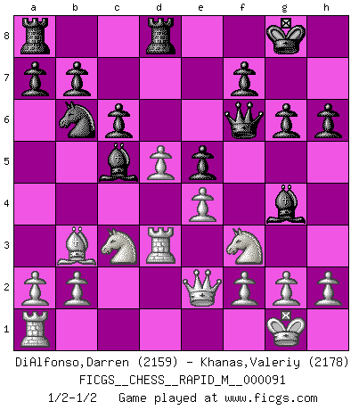 Last move : 1/2-1/2 2018 January 29 11:14:21 [Event "FICGS__CHESS__RAPID_M__000091"] [Site "FICGS"] [Date "2018.01.14"] [Round "1"] [White "DiAlfonso,Darren"] [Black "Khanas,Valeriy"] [Result "1/2-1/2"] [WhiteElo "2159"] [BlackElo "2178"] 1.d4 d5 2.c4 c6 3.Nf3 Nf6 4.Nc3 e6 5.Bg5 h6 6.Bxf6 Qxf6 7.e3 Nd7 8.Bd3 dxc4 9.Bxc4 g6 10.O-O Bg7 11.e4 e5 12.d5 Nb6 13.Nd2 O-O 14.Bb3 Rd8 15.Qe2 Bf8 16.Rfd1 Bc5 17.Nf3 Bg4 18.Rd3 1/2-1/2 QGD Slav : 4.Nc3 Kingside Castling by player White (move 10) Kingside Castling by player Black (move 13) This chess game ended in a draw. Follow this game move after move (download)You cannot play at Chess if you are kind-hearted. (French Proverb) Ich liebe den Moment, wenn ich das Ego meines Gegenüber breche. (Robert James Fischer) En el tablero, la mentira e hipocresía no sobreviven mucho. (Emanuel Lasker) Vous m'avez demandé de vous exposer quel est le fondement de la prière. Je ne fais que préparer les pièces du jeu sur la table... Nous sera-t-il permis d'en adopter les règles et si nous les appliquons scrupuleusement nous ne tarderons pas à faire mat le Roi divin ! Il ne pourra échapper à nos mains. (Sainte Thérèse d'Avila, Chemin de perfection) I would love to change the world, but they won't give me the source code. (Unknown)