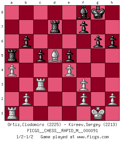 Last move : 1/2-1/2 2018 January 22 14:53:37 [Event "FICGS__CHESS__RAPID_M__000091"] [Site "FICGS"] [Date "2018.01.14"] [Round "1"] [White "Ortiz,Clodomiro"] [Black "Kireev,Sergey"] [Result "1/2-1/2"] [WhiteElo "2225"] [BlackElo "2213"] 1.d4 d5 2.Nf3 Nf6 3.c4 c6 4.Nc3 e6 5.Bg5 h6 6.Bxf6 Qxf6 7.e3 Nd7 8.Bd3 dxc4 9.Bxc4 g6 10.O-O Bg7 11.e4 e5 12.d5 Nb6 13.Bb3 Bg4 14.Re1 Bxf3 15.Qxf3 Qxf3 16.gxf3 O-O 17.dxc6 bxc6 18.Na4 Rfc8 19.Rac1 Bf8 20.Red1 Rc7 21.Rc2 c5 22.Bd5 Rb8 23.Nxb6 axb6 24.a4 Rd7 25.Rc3 Ra8 26.Ra1 Ra5 1/2-1/2 Queen's pawn game Kingside Castling by player White (move 10) Kingside Castling by player Black (move 16) This chess game ended in a draw. Follow this game move after move (download)Avoid the crowd. Do your own thinking independently. Be the Chess player, not the Chess piece. (Ralph Charell) Ein guter Spieler hat immer Glück. (José Raúl Capablanca) El Ajedrez es la vida. (Bobby Fischer) Aux échecs, les retours au sommet sont rares : les dommages psychologiques consécutifs à une défaite sont trop sévères. (Daily Telegraph) Live, lose, and learn, by observing your opponent how to win. (Amber Steenbock)