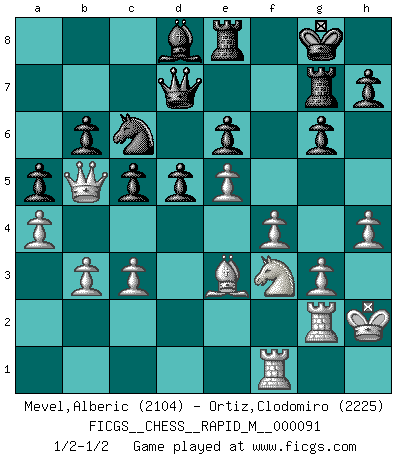 Last move : 1/2-1/2 2018 May 8 22:13:14 [Event "FICGS__CHESS__RAPID_M__000091"] [Site "FICGS"] [Date "2018.01.14"] [Round "1"] [White "Mevel,Alberic"] [Black "Ortiz,Clodomiro"] [Result "1/2-1/2"] [WhiteElo "2104"] [BlackElo "2225"] 1.e4 g6 2.d4 Bg7 3.Nc3 d6 4.f4 Nf6 5.Bd3 Na6 6.Nf3 O-O 7.O-O c5 8.d5 b6 9.Qe2 Nb4 10.Bc4 e6 11.dxe6 Bxe6 12.Bxe6 fxe6 13.e5 Ne8 14.Ne4 d5 15.Nf2 Nc7 16.c3 Nc6 17.Ng4 a5 18.a4 Ne7 19.Be3 Nf5 20.Bf2 Qc8 21.g3 Qa6 22.Qd1 Qb7 23.b3 Rac8 24.Re1 Na6 25.Rb1 Qe7 26.Qd3 Nb8 27.Qb5 Nd7 28.Ne3 Nxe3 29.Bxe3 Rfe8 30.Kg2 Bf8 31.Re2 Rc7 32.Nd2 Qd8 33.h4 Qa8 34.Kh2 Qc6 35.Qd3 Nb8 36.Rh1 Rg7 37.Rg2 Qb7 38.Rf1 Be7 39.Nf3 Nc6 40.Bd2 Qd7 41.Be3 Bd8 42.Qb5 1/2-1/2 Robatsch defense : Pseudo-Austrian attack Kingside Castling by player Black (move 6) Kingside Castling by player White (move 7) This chess game ended in a draw. Follow this game move after move (download)Bobby Fischer's current state of mind is indeed a tragedy. One of the world's greatest Chess players - the pride and sorrow of American Chess. (Frank Brady) Strategie ist, wie man ein Mädchen auf den Rücksitz bekommt. Taktik ist, was man tut, wenn man dann dort ist. (Anonymous) Una buena memoria, concentración, imaginación y una fuerte voluntad, se requiere para llegar a ser un buen jugador. (Bobby Fischer) RxDa4 pat (...) There are two types of people in this world, good and bad. The good sleep better, but the bad seem to enjoy the waking hours much more. (Woody Allen)
