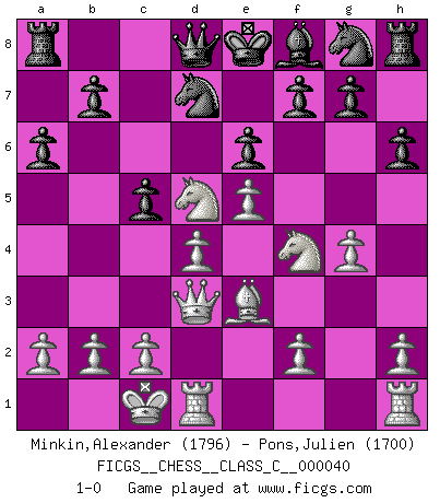 Last move : 1-0 2007 July 8 4:12:35 [Event "FICGS__CHESS__CLASS_C__000040"] [Site "FICGS"] [Date "2007.04.21"] [Round "1"] [White "Minkin,Alexander"] [Black "Pons,Julien"] [Result "1-0"] [WhiteElo "1796"] [BlackElo "1700"] 1.e4 c6 2.d4 d5 3.e5 Bf5 4.Nc3 e6 5.g4 Bg6 6.Nge2 h6 7.Nf4 Bh7 8.Be3 Nd7 9.Bd3 Bxd3 10.Qxd3 a6 11.O-O-O c5 12.Ncxd5 1-0 Caro-Kann : Advance variation Queenside Castling by player White (move 11) Player White won this chess game. Follow this game move after move (download)We don't really know how the game was invented, though there are suspicions. As soon as we discover the culprits, we'll let you know. (Bruce Pandolfini) Die Jungen erwarten, dass Opa einfach umfällt. Dann aber kann Opa fünf Stunden lang Schach spielen und die jungen Gegner an die Wand drücken. (Viktor Kortschnoi) Combinaciones deslumbrantes son para la mayoría, mover madera es para los pocos. (Georg Kieninger) Le temps de noter son nom sur la feuille de partie, j'étais déjà en zeitnot ! D'un modeste amateur apparié lors de la première ronde d'un open contre le grand-maître Azmaïparashvili. But they are useless. They can only give you answers. (Pablo Picasso, about computers)