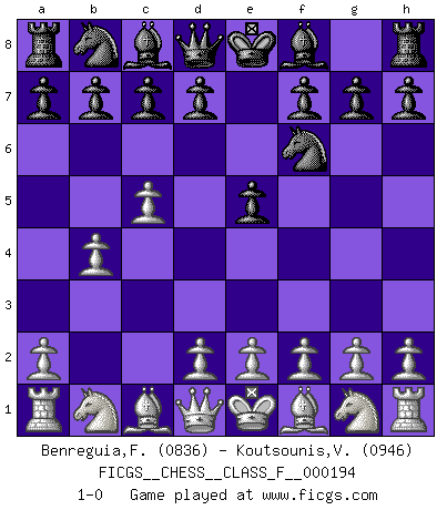 Last move : 1-0 2018 February 27 15:34:35 [Event "FICGS__CHESS__CLASS_F__000194"] [Site "FICGS"] [Date "2018.01.14"] [Round "1"] [White "Benreguia,Frederic"] [Black "Koutsounis,Vassilios"] [Result "1-0"] [WhiteElo "0836"] [BlackElo "0946"] 1.b4 Nf6 2.c4 e5 3.c5 1-0 This chess game has been lost on time (started : 2018.01.14 23:53:13) Polish (Sokolsky) opening Player White won this chess game. Follow this game move after move (download)The passed pawn is a criminal, who should be kept under lock and key. Mild measures, such as police surveillance, are not sufficient. (Nimzovitch) Wenn ich mich einlogge, glauben die Leute gewöhnlich nicht, dass ich es selbst bin und sie fangen an, mir dumme Fragen zu stellen. Und wenn sie es glauben, stellen sie wieder andere dumme Fragen. (Judith Polgar) El Ajedrez es una guerra en un tablero. El objetivo es aplastar la mente del oponente. (Bobby Fischer) Fischer est le meilleur joueur du monde et Karpov n'est qu'un joueur de bistrot. (Garry Kasparov, agé de 16 ans) There will be no order, only chaos. (Sol Robeson in Pi by Darren Aronofsky)