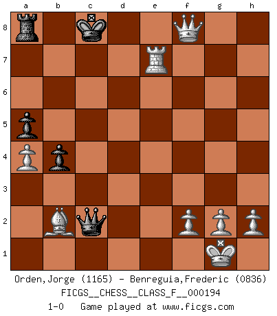 Last move : 1-0 2018 February 24 22:25:27 [Event "FICGS__CHESS__CLASS_F__000194"] [Site "FICGS"] [Date "2018.01.14"] [Round "1"] [White "Orden,Jorge"] [Black "Benreguia,Frederic"] [Result "1-0"] [WhiteElo "1165"] [BlackElo "0836"] 1.d4 d5 2.Nf3 Bg4 3.e3 Qd6 4.Be2 c6 5.c4 Nf6 6.c5 Qc7 7.O-O e6 8.Ne5 Bxe2 9.Qxe2 Be7 10.Nc3 O-O 11.b4 b6 12.a4 Nbd7 13.e4 Nxe5 14.dxe5 Qxe5 15.Bb2 Qc7 16.Rfc1 bxc5 17.exd5 cxb4 18.Ne4 Nxe4 19.Rxc6 Qd7 20.Qxe4 exd5 21.Qd4 Bf6 22.Rxf6 Qe7 23.Qg4 a5 24.Rh6 g6 25.Qh3 f6 26.Qh4 g5 27.Rxh7 Qxh7 28.Qd4 Qc2 29.Qxd5+ Kg7 30.Qxg5+ Kf7 31.Qxf6+ Ke8 32.Re1+ Kd7 33.Re7+ Kc8 34.Qxf8+ 1-0 Queen's pawn game Kingside Castling by player White (move 7) Kingside Castling by player Black (move 10) Player White won this chess game. Follow this game move after move (download)Morphy was probably the greatest genius of them all. (Bobby Fischer) Wie gewinnt Tal? Er entwickelt alle seine Figuren in die Brettmitte und opfert sie dann irgendwo. (Robert James Fischer) Con el tiempo, empecé a progresar en partidas decisivas. Tal vez porque me di cuenta de una simple verdad: no solo estaba yo nervioso sino también mi oponente. (Mikhail Tal) La vie est comme un jeu d'échecs : nous esquissons un plan, mais celui-ci est tributaire de ce que daignent faire l'adversaire aux échecs et le destin dans la vie. (Arthur Schopenhauer) Man is reluctant to give credit for intelligence to anyone, except his enemies. (Albert Einstein)