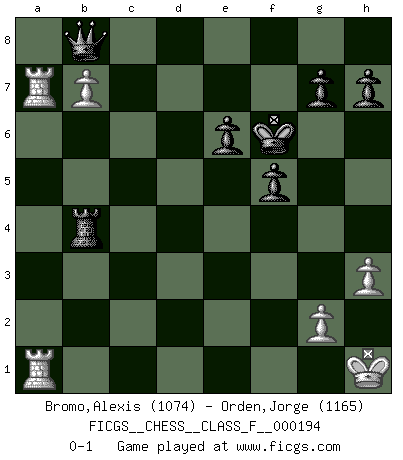 Last move : 0-1 2018 February 23 9:59:55 [Event "FICGS__CHESS__CLASS_F__000194"] [Site "FICGS"] [Date "2018.01.14"] [Round "1"] [White "Bromo,Alexis"] [Black "Orden,Jorge"] [Result "0-1"] [WhiteElo "1074"] [BlackElo "1165"] 1.d4 d5 2.c4 e6 3.a3 Nf6 4.Nc3 Be7 5.Nf3 O-O 6.Bf4 a6 7.e3 b6 8.Be2 Bb7 9.O-O c6 10.b4 Ne4 11.Nxe4 dxe4 12.Ne5 f6 13.Ng4 Bd6 14.Bxd6 Qxd6 15.f3 exf3 16.Bxf3 Nd7 17.b5 Rab8 18.a4 a5 19.Qb3 c5 20.Bxb7 Rxb7 21.Rad1 f5 22.dxc5 Qxc5 23.Nf2 Ne5 24.Nd3 Qxe3+ 25.Kh1 Rd7 26.Nxe5 Qxb3 27.Rxd7 Qxa4 28.Rd6 Qc2 29.Rxb6 a4 30.Ra6 Qe2 31.Ra1 Qxe5 32.R6xa4 Rc8 33.h3 Rxc4 34.Ra8+ Kf7 35.b6 Rb4 36.R8a7+ Kf6 37.b7 Qb8 0-1 Queen's gambit declined Kingside Castling by player Black (move 5) Kingside Castling by player White (move 9) Player Black won this chess game. Follow this game move after move (download)You know, comrade Pachman, I don't enjoy being a Minister, I would rather play Chess like you. (Che Guevara) Als er Schachweltmeister wurde ließ er praktisch alle stärksten Sovietspieler für sich arbeiten. Wenn ein auch nur mittelmässiger Meister ein Spezialist für eine bestimmte Eröffnung war, wurde er von Karpov gerufen. Das wurde alles geheim gehalten. (Mikhail Moiseyevich Botvinik) Me siento como si fuera una pieza en una partida de Ajedrez, cuando mi oponente me indica: esa pieza no puede ser movida. (Soren Kierkegaard) Il s'avisa de me proposer d'apprendre les échecs qu'il jouait un peu... me voilà forcené des échecs. J'achète un échiquier, je m'enferme dans ma chambre, j'y passe des jours et des nuits à vouloir apprendre par cœur toutes les parties. (Jean-Jacques Rousseau, Confessions) Empty your mind, be formless, shapeless — like water. (Bruce Lee)