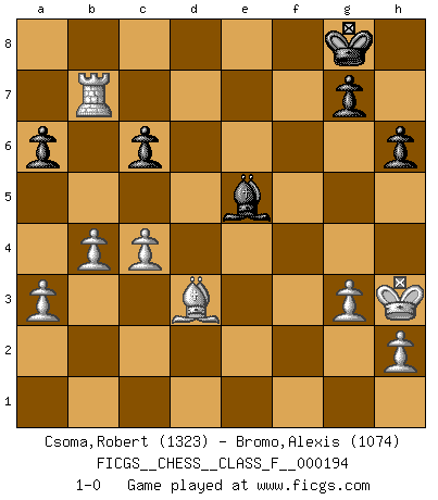 Last move : 1-0 2018 January 20 17:14:18 [Event "FICGS__CHESS__CLASS_F__000194"] [Site "FICGS"] [Date "2018.01.14"] [Round "1"] [White "Csoma,Robert"] [Black "Bromo,Alexis"] [Result "1-0"] [WhiteElo "1323"] [BlackElo "1074"] 1.Nf3 d5 2.c4 e6 3.g3 Nf6 4.Bg2 c6 5.b3 Bb4 6.O-O O-O 7.a3 Ba5 8.Bb2 Nbd7 9.d3 h6 10.Nbd2 Re8 11.d4 a6 12.Ne5 Nxe5 13.dxe5 Nd7 14.Rc1 Bc7 15.f4 f5 16.exf6 Nxf6 17.e4 Nxe4 18.Nxe4 dxe4 19.Bxe4 Qe7 20.Qc2 e5 21.Bg6 Rf8 22.fxe5 Qc5+ 23.Kg2 Rxf1 24.Rxf1 Bxe5 25.Qe4 Bh3+ 26.Kxh3 Bxb2 27.b4 Qe5 28.Qxe5 Bxe5 29.Rf7 Rd8 30.Rxb7 Rd3 31.Bxd3 1-0 Reti Opening Kingside Castling by player White (move 6) Kingside Castling by player Black (move 6) Player White won this chess game. Follow this game move after move (download)Chess is a terrific way for kids to build self image and self esteem. (Saudin Robovic) Ohne Leiden bildet sich kein Charakter. (Ernst Freiherr von Feuchtersleben) Yo siempre he tenido un ligero sentimiento de lástima por una persona que no tiene conocimiento del Ajedrez. (Siegbert Tarrasch) Des points faibles ou des trous dans la position de l'adversaire doivent être occupés par des pièces et non pas par des pions. (Siegbert Tarrasch) There are lots of people who mistake their imagination for their memory. (Josh Bilings)