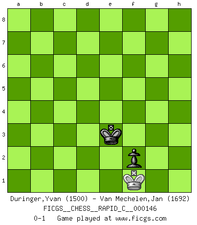 Last move : 0-1 2018 June 5 13:2:16 [Event "FICGS__CHESS__RAPID_C__000146"] [Site "FICGS"] [Date "2018.01.15"] [Round "1"] [White "Duringer,Yvan"] [Black "Van Mechelen,Jan"] [Result "0-1"] [WhiteElo "1500"] [BlackElo "1692"] 1.e4 c5 2.Nf3 d6 3.h3 Nc6 4.Bb5 Bd7 5.O-O Nf6 6.Nc3 g6 7.d3 Bg7 8.Bg5 O-O 9.Re1 a6 10.Ba4 b5 11.Bb3 Na5 12.e5 dxe5 13.a3 Nxb3 14.cxb3 Bc6 15.Nxe5 Bb7 16.Qd2 Nd5 17.Bh6 Nxc3 18.bxc3 Qd5 19.Nf3 e6 20.Bxg7 Kxg7 21.c4 Qd6 22.Qe3 Rad8 23.Rad1 Qc6 24.d4 cxd4 25.Rxd4 Kg8 26.cxb5 axb5 27.Rc1 Qa6 28.b4 Bd5 29.Ne5 Ra8 30.Nd7 Qxa3 31.Qxa3 Rxa3 32.Nf6+ Kg7 33.Nxd5 exd5 34.Rxd5 Re8 35.Rxb5 Ra2 36.Rb7 R8e2 37.Rf1 Rab2 38.b5 Re5 39.b6 Re6 40.Rd1 Rexb6 41.Rc7 Rb1 42.Rxb1 Rxb1+ 43.Kh2 Rb3 44.f3 Rb2 45.Kg3 Ra2 46.Rb7 Rc2 47.f4 Rc3+ 48.Kg4 Rc2 49.g3 Rc3 50.Rd7 Rb3 51.h4 h5+ 52.Kh3 Rb2 53.Rd3 Rb5 54.g4 hxg4+ 55.Kxg4 Ra5 56.Rd7 Rf5 57.Rc7 Rh5 58.Re7 Rf5 59.Re5 Rxe5 60.fxe5 f6 61.e6 Kf8 62.h5 gxh5+ 63.Kxh5 Ke7 64.Kg4 Kxe6 65.Kf4 f5 66.Ke3 Ke5 67.Kf3 f4 68.Ke2 Ke4 69.Kf2 f3 70.Ke1 Ke3 71.Kf1 f2 0-1 This chess game has been lost on time (started : 2018.01.15 4:0:0) Sicilian Kingside Castling by player White (move 5) Kingside Castling by player Black (move 8) 10 pieces endgame at move 42 : White KRPPP , Black KRPPP WHITE : King + 1 Rook 3 Pawns BLACK : King + 1 Rook 3 Pawns 9 pieces endgame at move 54 : White KRPP , Black KRPPP WHITE : King + 1 Rook 2 Pawns BLACK : King + 1 Rook 3 Pawns 8 pieces endgame at move 55 : White KRPP , Black KRPP WHITE : King + 1 Rook 2 Pawns BLACK : King + 1 Rook 2 Pawns 7 pieces endgame at move 59 : White KPP , Black KRPP WHITE : King + 2 Pawns BLACK : King + 1 Rook 2 Pawns 6 pieces endgame at move 60 : White KPP , Black KPP WHITE : King + 2 Pawns BLACK : King + 2 Pawns 5 pieces endgame at move 62 : White KP , Black KPP WHITE : King + 1 Pawn BLACK : King + 2 Pawns 4 pieces endgame at move 63 : White KP , Black KP WHITE : King + 1 Pawn BLACK : King + 1 Pawn 3 pieces endgame at move 64 : White K , Black KP WHITE : King + BLACK : King + 1 Pawn Player Black won this chess game. Follow this game move after move (download)Chess is in its essence a game, in its form an art, and in its execution a science. (Baron Tassilo) Gewinnen beim Schach fördert das Selbstvertrauen. Beim Sex spüre ich sowas nicht... (Garry Kasparov) La caracteristica mas importante en la posición del Ajedrez es la actividad de las piezas. Esto es absolutamente fundamental en todas las fases del juego: Apertura, Juego Medio y especialmente Finales. La limitación primordial en la actividad de una pieza, es la estructuración de los Peones. (Michael Stean) La vérité est comme le meilleur coup aux échecs : elle existe, mais il faut la chercher. (Arturo Perez-Reverte) The right perception of any matter and a misunderstanding of the same matter do not wholly exclude each other. (Kafka's the trial)