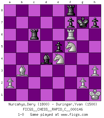 Last move : 1-0 2018 February 19 22:18:31 [Event "FICGS__CHESS__RAPID_C__000146"] [Site "FICGS"] [Date "2018.01.15"] [Round "1"] [White "Nurcahyo,Dery"] [Black "Duringer,Yvan"] [Result "1-0"] [WhiteElo "1800"] [BlackElo "1500"] 1.e4 e5 2.c3 Nf6 3.d3 d6 4.Be3 Nc6 5.h3 Be7 6.Be2 O-O 7.Nf3 b6 8.Na3 Bb7 9.Qd2 Qd7 10.b4 d5 11.O-O dxe4 12.dxe4 Qxd2 13.Nxd2 a5 14.Nb5 axb4 15.Nxc7 Rac8 16.Nd5 bxc3 17.Nxc3 Nd4 18.Bc4 Nc2 19.Rab1 Nxe3 20.fxe3 Bxe4 21.Rxb6 Bc5 22.Rbxf6 gxf6 23.Ncxe4 Bxe3+ 24.Kh1 Rc6 25.Bb3 Kg7 26.Nc4 Bd4 27.Ncd6 Kg6 28.Rxf6+ Kg7 29.Nf5+ 1-0 Variation Lopez Opening : Lopez Opening Kingside Castling by player Black (move 6) Kingside Castling by player White (move 11) Player White won this chess game. Follow this game move after move (download)If your opponent offers you a draw, try to work out why he thinks he's worse off. (Nigel Short) Ich habe die Schachforschung dermaßen betrieben, dass sie auf eine wissenschaftliche Basis gestellt wurde. (Mikhail Moiseyevich Botvinik) Me siento como si fuera una pieza en una partida de Ajedrez, cuando mi oponente me indica: esa pieza no puede ser movida. (Soren Kierkegaard) La menace est plus forte que l'exécution. (Aaron Nimzovitch) I have opinions of my own - strong opinions - but I don't always agree with them. (George Bush)