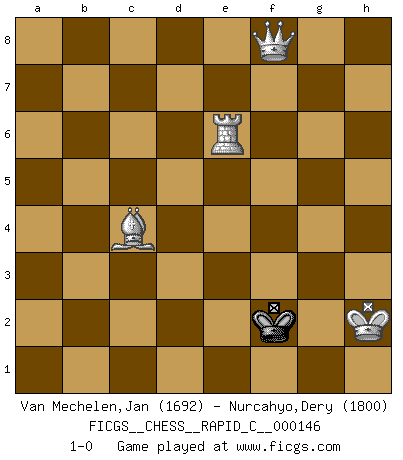 Last move : 1-0 2018 March 26 18:14:0 [Event "FICGS__CHESS__RAPID_C__000146"] [Site "FICGS"] [Date "2018.01.15"] [Round "1"] [White "Van Mechelen,Jan"] [Black "Nurcahyo,Dery"] [Result "1-0"] [WhiteElo "1692"] [BlackElo "1800"] 1.d4 Nf6 2.c4 e6 3.Nf3 h6 4.g3 Nc6 5.Bg2 d5 6.Nbd2 Bd7 7.O-O Be7 8.b3 O-O 9.Bb2 dxc4 10.bxc4 Be8 11.e4 Nh7 12.e5 Qd7 13.h4 Rb8 14.a4 a5 15.Ne4 b6 16.Qe2 f5 17.exf6 Nxf6 18.Nxf6+ Bxf6 19.Bh3 Bf7 20.d5 Nd8 21.Bxf6 gxf6 22.Nd4 Bg6 23.Nxe6 Re8 24.Qg4 Qf7 25.h5 f5 26.Qxg6+ Qxg6 27.hxg6 Nxe6 28.dxe6 Rxe6 29.Bxf5 Re5 30.g4 Rd8 31.Rfe1 Rc5 32.Re7 Rxc4 33.Be6+ Kf8 34.Rf7+ Ke8 35.Bxc4 Rd4 36.Be6 c6 37.g7 Rxg4+ 38.Bxg4 Kxf7 39.Rb1 Kxg7 40.Rxb6 c5 41.Be2 c4 42.Bxc4 h5 43.Ra6 h4 44.Rxa5 Kg6 45.Re5 h3 46.a5 h2+ 47.Kxh2 Kf6 48.Re6+ Kf5 49.a6 Kf4 50.a7 Kf3 51.a8Q+ Kxf2 52.Qf8+ 1-0 Queen's pawn game Kingside Castling by player White (move 7) Kingside Castling by player Black (move 8) 10 pieces endgame at move 39 : White KRBPP , Black KPPPP WHITE : King + 1 Rook 1 Bishop 2 Pawns BLACK : King + 4 Pawns 9 pieces endgame at move 40 : White KRBPP , Black KPPP WHITE : King + 1 Rook 1 Bishop 2 Pawns BLACK : King + 3 Pawns 8 pieces endgame at move 42 : White KRBPP , Black KPP WHITE : King + 1 Rook 1 Bishop 2 Pawns BLACK : King + 2 Pawns 7 pieces endgame at move 44 : White KRBPP , Black KP WHITE : King + 1 Rook 1 Bishop 2 Pawns BLACK : King + 1 Pawn 6 pieces endgame at move 47 : White KRBPP , Black K WHITE : King + 1 Rook 1 Bishop 2 Pawns BLACK : King + Promotion Queen by player White (move 51) 5 pieces endgame at move 51 : White KQRB , Black K WHITE : King + 1 Queen 1 Rook 1 Bishop BLACK : King + Player White won this chess game. Follow this game move after move (download)Chess is war over the board. The object is to crush the opponents mind. (Bobby Fischer) Ohne Leiden bildet sich kein Charakter. (Ernst Freiherr von Feuchtersleben) Nunca antes ha habido un jugador de Ajedrez con tal conocimiento a fondo de las complejidades del juego y una inmensa voluntad absolutamente indomable de ganar. Yo pienso que Fischer es el jugador mas grande que jamás haya existido. (Lisa Lane) Il vaut mieux sacrifier les pièces de l'adversaire. (Xavier Tartacover) If passion drives you, let reason holds the reins. (Benjamin Franklin)