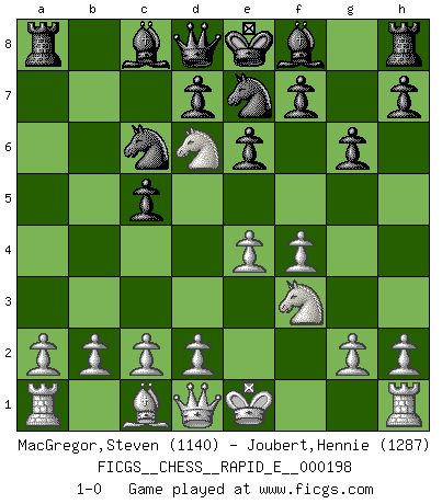 Last move : 1-0 2018 February 1 13:14:40 [Event "FICGS__CHESS__RAPID_E__000198"] [Site "FICGS"] [Date "2018.01.15"] [Round "1"] [White "MacGregor,Steven"] [Black "Joubert,Hennie"] [Result "1-0"] [WhiteElo "1140"] [BlackElo "1287"] 1.e4 c5 2.Nc3 Nc6 3.f4 e6 4.Bb5 Nge7 5.Nf3 a6 6.Ba4 b5 7.Bxb5 axb5 8.Nxb5 g6 9.Nd6+ 1-0 Sicilian : Grand Prix attack Player White won this chess game. Follow this game move after move (download)The way he plays Chess demonstrates a man's whole nature. (Stanley Ellin) Ich kenne Menschen, die allen Willen der Welt besitzen und doch nicht Schach spielen können. (Robert James Fischer) El Ajedrez demanda una total concentración. (Bobby Fischer) Les échecs sont un jeu terrible. Si vous n'avez pas le centre, votre adversaire a une position plus libre. Par contre, si vous avez le centre, alors vous avez vraiment quelque chose pour laquelle vous inquiéter ! (Siegbert Tarrasch) There are two types of people in this world, good and bad. The good sleep better, but the bad seem to enjoy the waking hours much more. (Woody Allen)