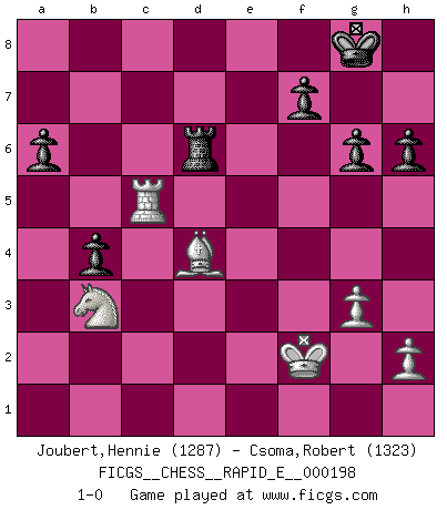 Last move : 1-0 2018 March 24 7:31:52 [Event "FICGS__CHESS__RAPID_E__000198"] [Site "FICGS"] [Date "2018.01.15"] [Round "1"] [White "Joubert,Hennie"] [Black "Csoma,Robert"] [Result "1-0"] [WhiteElo "1287"] [BlackElo "1323"] 1.e4 d6 2.d4 Nf6 3.f3 e6 4.c4 Nxe4 5.fxe4 Qh4+ 6.Ke2 Qxe4+ 7.Be3 Nc6 8.Nc3 Qg6 9.Nf3 Be7 10.g3 O-O 11.Bg2 Bd7 12.Rf1 d5 13.b3 Bb4 14.Na4 dxc4 15.Nc5 Bxc5 16.dxc5 Rad8 17.Kf2 cxb3 18.axb3 Bc8 19.Qc1 a6 20.Kg1 Nb4 21.Ne5 Qh5 22.Nf3 Nd3 23.Qc3 e5 24.Rfd1 e4 25.Nd4 Qxc5 26.Rxd3 Qe5 27.Rd2 c5 28.Ne2 Qxc3 29.Nxc3 Be6 30.Rxd8 Rxd8 31.Bxc5 Bxb3 32.Bxe4 Rc8 33.Bb4 Rc7 34.Rb1 Be6 35.Rd1 g6 36.Bd5 Bxd5 37.Rxd5 h6 38.Kf2 Rc4 39.Ba5 Rc6 40.Ne2 b6 41.Bd2 b5 42.Nd4 Rb6 43.Be3 b4 44.Nb3 Rc6 45.Rc5 Rd6 46.Bd4 1-0 King's pawn Opening Kingside Castling by player Black (move 10) Player White won this chess game. Follow this game move after move (download)Chess is a part of culture and if a culture is declining then Chess too will decline. (Mikhail Botvinnik) Jeder Fehler erscheint unglaublich dumm, wenn andre ihn begehen. (Georg Christoph Lichtenberg) El Ajedrez es un regaderazo frío para la mente. (Sir John Simon) Tous ces prétendus hommes politiques sont les pions, les Cavaliers, les Tours ou les Fous d'une partie d'échecs qui se jouera tant qu'un hasard ne renversera pas l'échiquier. (Honoré de Balzac) No man has ever achieved immortality in his own life time. (Unknown)