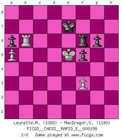 Last move : 1-0 2018 March 3 9:12:55 [Event "FICGS__CHESS__RAPID_E__000198"] [Site "FICGS"] [Date "2018.01.15"] [Round "1"] [White "Leurette,Marc-Antoine"] [Black "MacGregor,Steven"] [Result "1-0"] [WhiteElo "1083"] [BlackElo "1140"] 1.e4 e6 2.d4 d5 3.exd5 Qxd5 4.Nc3 Bb4 5.Nge2 c5 6.a3 cxd4 7.Nxd4 Bxc3+ 8.bxc3 Nf6 9.Qf3 O-O 10.Bd3 e5 11.Qxd5 Nxd5 12.Ne2 Re8 13.O-O Nc6 14.Bb5 Bd7 15.c4 Nf6 16.a4 a6 17.Bxc6 Bxc6 18.a5 Rac8 19.Ba3 Be4 20.c5 Bxc2 21.Rac1 Bd3 22.Rfe1 Bxe2 23.Rxe2 Re6 24.f3 Nd5 25.g3 Nc7 26.h4 Nb5 27.Bb4 Nd4 28.Re3 Nf5 29.R3e1 Nxg3 30.Rc4 Nf5 31.Kg2 Ne7 32.Kg3 Nc6 33.Rec1 Nxb4 34.Rxb4 Rc7 35.R1c4 Rec6 36.Kg4 Kf8 37.Kf5 f6 38.h5 Ke7 39.Ke4 Ke6 40.Rb3 f5+ 41.Ke3 Kd5 42.R4c3 Rxc5 43.Rd3+ Ke6 44.Rb6+ R5c6 45.Rc3 Ke7 46.R3xc6 Rxc6 47.Rxb7+ Kf6 48.Rb6 Re6 49.Kd3 g6 50.hxg6 hxg6 51.Kc4 Ke7 52.Kd5 Rf6 53.Kxe5 1-0 French : Exchange variation Kingside Castling by player Black (move 9) Kingside Castling by player White (move 13) 10 pieces endgame at move 50 : White KRPP , Black KRPPPP WHITE : King + 1 Rook 2 Pawns BLACK : King + 1 Rook 4 Pawns 9 pieces endgame at move 53 : White KRPP , Black KRPPP WHITE : King + 1 Rook 2 Pawns BLACK : King + 1 Rook 3 Pawns Player White won this chess game. Follow this game move after move (download)Suddenly it was obvious to me in my analysis I had missed what Fischer had found with the greatest of ease at the board. (Mikhail Botvinnik) Intelligenz läßt sich nicht am Weg, sondern nur am Ergebnis feststellen. (Garry Kasparov) Si tu oponente no puede hacer nada activo, entonces no apures la posición; En vez de eso, dejalo estar sentado ahí, sufriendo y rogandote por un empate. (Jeremy Silman) Tout change constamment, y compris dans le monde des Echecs. (Botvinnik) I can't decide which is riskier; taking crazy risks, or taking advice on crazy risks from a crazy risk taker. (Gregory House in House M.D.)