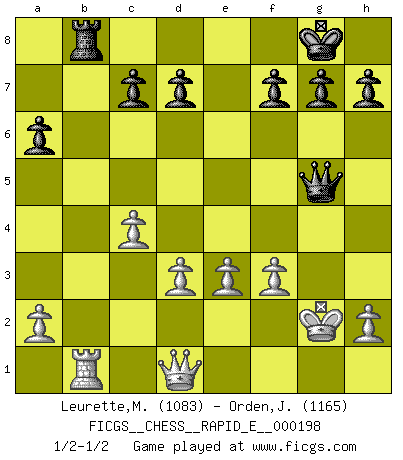 Last move : 1/2-1/2 2018 February 10 8:56:3 [Event "FICGS__CHESS__RAPID_E__000198"] [Site "FICGS"] [Date "2018.01.15"] [Round "1"] [White "Leurette,Marc-Antoine"] [Black "Orden,Jorge"] [Result "1/2-1/2"] [WhiteElo "1083"] [BlackElo "1165"] 1.e4 e5 2.Nf3 Nc6 3.Bc4 Bc5 4.Nc3 Nf6 5.O-O O-O 6.d3 a6 7.Re1 b5 8.Bd5 Bb7 9.Be3 Bxe3 10.Rxe3 Nxd5 11.exd5 Ne7 12.Nxe5 Nxd5 13.Nxd5 Bxd5 14.Nf3 Re8 15.b3 Qf6 16.c4 Rxe3 17.fxe3 Bxf3 18.gxf3 Qg5+ 19.Kf2 bxc4 20.bxc4 Rb8 21.Rb1 Qh4+ 22.Kg1 Qg5+ 23.Kf2 Qh4+ 24.Kg2 Qg5+ 1/2-1/2 Giuoco Piano : Four knights variation Kingside Castling by player White (move 5) Kingside Castling by player Black (move 5) This chess game ended in a draw. Follow this game move after move (download)In blitz, the Knight is stronger than the Bishop. (Vlastimil Hort) Ich war schon mal beim Dopingtest. Da musste ich Urin abgeben, während Dritte zusahen. (Elisabeth Pähtz) Un Peón pasado es un criminal, quién debe ser mantenido bajo candado y llave. Leves medidas, tales como vigilancia policiaca, no son suficientes. (Aaron Nimzovich) La solitude du joueur d'Echecs à l'approche du mat est semblable à celle du condamné. (Francis Szpiner) In fact if nothing is done against this teddy bear, hereby I announce that I would quit chess, rapid chess, blitz chess, postal chess, email chess, server chess and correspondence chess I will then switch to a table game where teddy bears aren't going to be seen for a while, like Poker, or Roulette, all 18+ games. (Elmer Valderrama)