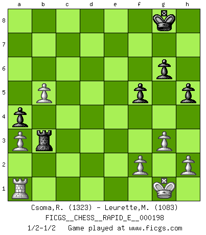 Last move : 1/2-1/2 2018 February 14 18:27:35 [Event "FICGS__CHESS__RAPID_E__000198"] [Site "FICGS"] [Date "2018.01.15"] [Round "1"] [White "Csoma,Robert"] [Black "Leurette,Marc-Antoine"] [Result "1/2-1/2"] [WhiteElo "1323"] [BlackElo "1083"] 1.Nf3 d5 2.c4 e6 3.g3 Nf6 4.Bg2 Be7 5.O-O O-O 6.d4 b6 7.cxd5 exd5 8.Nc3 Be6 9.Bf4 Bd6 10.Qd2 Bxf4 11.Qxf4 c6 12.Rac1 Nbd7 13.e4 dxe4 14.Nxe4 Nd5 15.Qd6 c5 16.dxc5 bxc5 17.Nxc5 Nxc5 18.Qxc5 a5 19.Rfd1 Rc8 20.Qa3 Rxc1 21.Rxc1 Nb4 22.b3 Qb6 23.Ne1 g6 24.Qb2 Rd8 25.a3 Nd3 26.Nxd3 Rxd3 27.b4 a4 28.Qa1 Rd2 29.Rf1 Bc4 30.Qc3 Qd4 31.Qxd4 Rxd4 32.Ra1 f5 33.Bf1 h5 34.Bxc4+ Rxc4 35.b5 Rc3 36.Rb1 Rb3 37.Ra1 1/2-1/2 Reti Opening Kingside Castling by player White (move 5) Kingside Castling by player Black (move 5) This chess game ended in a draw. Follow this game move after move (download)Chess is a terrible game. If you have no center, your opponent has a freer position. If you do have a center, then you really have something to worry about ! (Siegbert Tarrasch) Wie ich sie so einen nach dem anderen nieder mähte wurde meine Überlegenheit offensichtlich. (José Raúl Capablanca) Nos gusta pensar. (Gary Kasparov) D'abord les bases : Jouez et étudiez, puis étudiez et jouez, ensuite jouez et étudiez, puis étudiez et jouez. Deuxièmement : Donnez toujours le meilleur de vous-même ! (Ken Smith) Don't be irreplaceable, if you can't be replaced, you can't be promoted. (Dan Rotaru)
