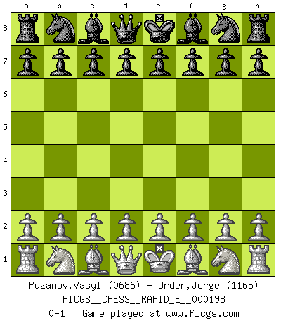 Last move : 0-1 2018 February 15 2:19:34 [Event "FICGS__CHESS__RAPID_E__000198"] [Site "FICGS"] [Date "2018.01.15"] [Round "1"] [White "Puzanov,Vasyl"] [Black "Orden,Jorge"] [Result "0-1"] [WhiteElo "0686"] [BlackElo "1165"] 0-1 This chess game has been lost on time (started : 2018.01.15 23:50:37) Player Black won this chess game. Follow this game move after move (download)The Pawns are the soul of the game. (Francois Andre Danican Philidor) Am wohlsten fühle ich mich, wenn ich sehe, wie sich mein Gegner im Todeskampf windet. (Robert James Fischer) Bobby Fischer es el mas grande genio de Ajedrez de todos los tiempos. (Alexander Kotov) Il (Jacob Murray) ne joue pas pour le bon coup, mais pour le meilleur. (Eloi Relange) Locking firmely the window serves nothing, only small thiefs pass through there, the big thiefs enter through the front door. (Luc-Olivier Leclerc)