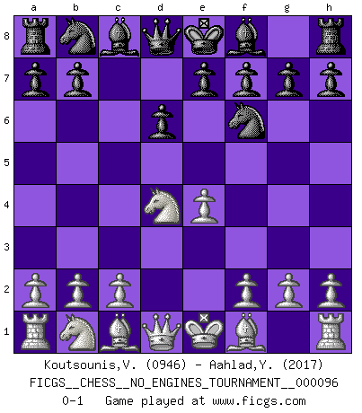 Last move : 0-1 2018 February 26 3:30:58 [Event "FICGS__CHESS__NO_ENGINES_TOURNAMENT__000096"] [Site "FICGS"] [Date "2018.01.16"] [Round "1"] [White "Koutsounis,Vassilios"] [Black "Aahlad,Yeturu"] [Result "0-1"] [WhiteElo "0946"] [BlackElo "2017"] 1.e4 c5 2.Nf3 d6 3.d4 cxd4 4.Nxd4 Nf6 0-1 This chess game has been lost on time (started : 2018.01.16 13:55:15) Sicilian Player Black won this chess game. Follow this game move after move (download)Chess opens and enriches your mind. (Saudin Robovic) Du kannst im Schach nur gut werden, wenn du das Spiel liebst. (Robert James Fischer) Evita las multitudes. Haz independientemente tu propio razonamiento. Trata de ser el jugador de Ajedrez, no la pieza de Ajedrez. (Ralph Charell) Horreur, mais aussi harmonie suprême : qu'y avait-il en effet au monde en dehors des échecs ? Le brouillard, l'inconnu, le non-être... (Vladimir Nabokov) Those who make the worst use of their time are the first to complain of its brevity. (Jean de la Bruyere)