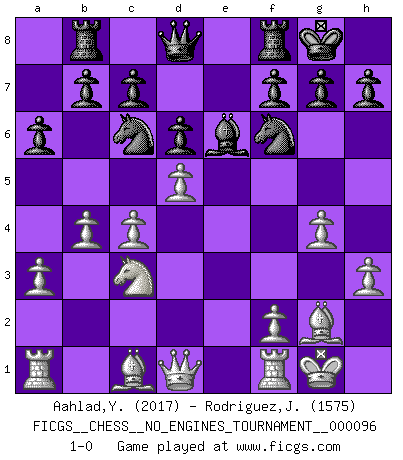 Last move : 1-0 2018 April 6 13:33:21 [Event "FICGS__CHESS__NO_ENGINES_TOURNAMENT__000096"] [Site "FICGS"] [Date "2018.01.16"] [Round "1"] [White "Aahlad,Yeturu"] [Black "Rodriguez,Juan Antonio"] [Result "1-0"] [WhiteElo "2017"] [BlackElo "1575"] 1.c4 e5 2.g3 Nc6 3.Nc3 Nf6 4.Bg2 Bc5 5.e3 d6 6.Nge2 Bg4 7.h3 Bd7 8.d4 Bb4 9.O-O O-O 10.a3 Bxc3 11.Nxc3 Rb8 12.b4 exd4 13.exd4 a6 14.g4 Be6 15.d5 1-0 English Opening Kingside Castling by player White (move 9) Kingside Castling by player Black (move 9) Player White won this chess game. Follow this game move after move (download)When you don't know what to do, wait for your opponent to get an idea - it's sure to be wrong. (Tarrasch) Ich verachte Kasparow. (Viktor Kortschnoi) Con o sin el título, Bobby Fischer fue sin lugar a dudas el mas grande jugador de su época. (Burt Hochberg) Mon pion favori sur ma case favorite ! Bronstein en parlant d'un coup de pion en h5 quand il avait les Noirs. When I took office, only high energy physicists had ever heard of what is called the World Wide Web... Now even my cat has its own page. (Bill Clinton, 1996)
