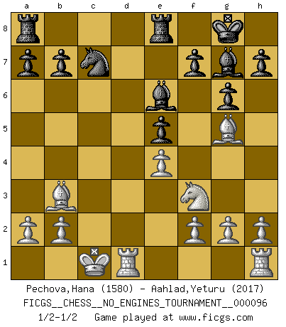 Last move : 1/2-1/2 2018 June 29 9:30:2 [Event "FICGS__CHESS__NO_ENGINES_TOURNAMENT__000096"] [Site "FICGS"] [Date "2018.01.16"] [Round "1"] [White "Pechova,Hana"] [Black "Aahlad,Yeturu"] [Result "1/2-1/2"] [WhiteElo "1580"] [BlackElo "2017"] 1.d4 Nf6 2.c4 g6 3.Nc3 Bg7 4.e4 d6 5.Nf3 O-O 6.Be2 e5 7.dxe5 dxe5 8.Qxd8 Rxd8 9.Bg5 Re8 10.Nd5 Nxd5 11.cxd5 c6 12.Bc4 cxd5 13.Bxd5 Na6 14.O-O-O Nc7 15.Bb3 Be6 1/2-1/2 King's Indian : Andersson variation Kingside Castling by player Black (move 5) Queenside Castling by player White (move 14) This chess game ended in a draw. Follow this game move after move (download)Strategy requires thought, tactics require observation. (Max Euwe) Im Spitzenschach von heute geht es nur um Vorbereitung, um tiefgründige, sorgfältige Eröffnungsvorbereitung. (Nigel Short) En la vida, como en el Ajedrez, los Peones propios obstruyen nuestro camino. La gran fortuna de un hombre, su comodidad, placer, hijos, libros, que deberían ayudarle a ganar, con mucha frecuencia lo ponen en Jaque Mate. (Charles Buxton) Dieu déplace le joueur, et celui-ci la pièce. Quel Dieu derrière Dieu commence donc la trame ? Arturo Perez-Reverte (prix de littérature policière 1993). What doesn't kill us makes us stronger. (Friedrich Nietzsche)