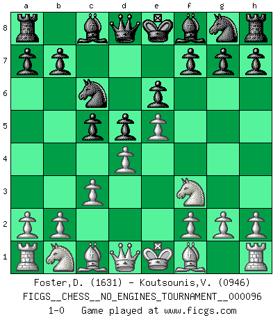 Last move : 1-0 2018 February 26 15:30:43 [Event "FICGS__CHESS__NO_ENGINES_TOURNAMENT__000096"] [Site "FICGS"] [Date "2018.01.16"] [Round "1"] [White "Foster,Duncan"] [Black "Koutsounis,Vassilios"] [Result "1-0"] [WhiteElo "1631"] [BlackElo "0946"] 1.e4 e6 2.d4 d5 3.e5 c5 4.c3 Nc6 5.Nf3 1-0 This chess game has been lost on time (started : 2018.01.16 13:55:15) French : Advance, Paulsen attack Player White won this chess game. Follow this game move after move (download)Weak points or holes in the opponent's position must be occupied by pieces not Pawns. (Siegbert Tarrasch) Zum Sieg gelangt man nicht, wenn man gut, sondern nur wenn man besser spielt (Savielly Grigorievitsch Tartakower) Si pudieramos observar el interior de la cabeza de un jugador de Ajedrez, encontraríamos ahí un mundo lleno de sentimientos, imágenes, ideas, emoción y pasión. (Alfred Binet) Votre seul travail dans les ouvertures est d'obtenir un milieu de partie jouable. (Lajos Portish) The hypothalamus is one of the most important parts of the brain, involved in many kinds of motivation, among other functions. The hypothalamus controls the 'Four Fs: Fighting, Fleeing, Feeding and Mating. (Unknown author)