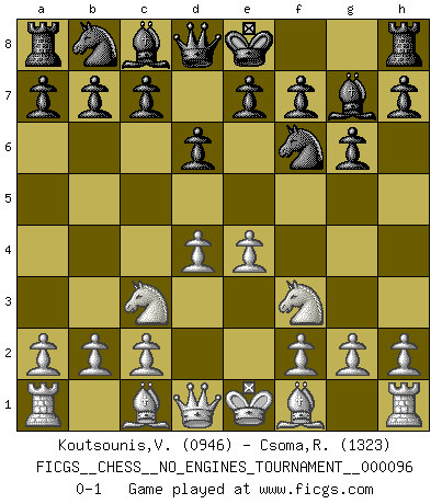 Last move : 0-1 2018 February 26 3:30:58 [Event "FICGS__CHESS__NO_ENGINES_TOURNAMENT__000096"] [Site "FICGS"] [Date "2018.01.16"] [Round "1"] [White "Koutsounis,Vassilios"] [Black "Csoma,Robert"] [Result "0-1"] [WhiteElo "0946"] [BlackElo "1323"] 1.e4 d6 2.d4 Nf6 3.Nc3 g6 4.Nf3 Bg7 0-1 This chess game has been lost on time (started : 2018.01.16 13:55:15) Pirc : Classical (Two knights) system Player Black won this chess game. Follow this game move after move (download)Up to this point White has been following well-known analysis. But now he makes a fatal error: he begins to use his own head. (Siegbert Tarrasch) Ihnen, Herr Lasker, habe ich nur drei Worte zu sagen: Schach und matt. (Siegbert Tarrasch) El sobresalir en el Ajedrez es un signo de una mente intrigante. (Sir Arthur Conan Doyle) Toutes choses étant égales, c'est la conviction qui gagne. Alliée à une volonté de vaincre, elle sert de détonateur, suscite des idées, disperse les doutes et aide à penser clairement. (Robert Fischer) Looking at the proliferation of personal web pages on the Net, it looks like very soon everyone on Earth will have 15 megabytes of fame. (M.G. Sriram)