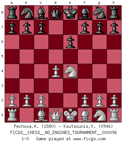 Last move : 1-0 2018 March 11 17:4:52 [Event "FICGS__CHESS__NO_ENGINES_TOURNAMENT__000096"] [Site "FICGS"] [Date "2018.01.16"] [Round "1"] [White "Pechova,Hana"] [Black "Koutsounis,Vassilios"] [Result "1-0"] [WhiteElo "1580"] [BlackElo "0946"] 1.e4 e6 2.d4 d5 3.Nc3 dxe4 4.Nxe4 1-0 This chess game has been lost on time (started : 2018.01.16 13:55:15) French : Rubinstein variation Player White won this chess game. Follow this game move after move (download)It's always better to sacrifice your opponent's men. (Savielly Tartakover) Mutter, ich bin eben Ex-Weltmeister geworden. --beim nach Hause Kommen nach dem Verlust des WM-Titels an Mihail Botvinnik -- (Mikhail Nekhemyevich Tal) Es el objetivo de la escuela moderna no tratar cada posición de acuerdo a una regla general, sino de acuerdo al principio inherente en la posición. (Richard Reti) Il (Jacob Murray) ne joue pas pour le bon coup, mais pour le meilleur. (Eloi Relange) Men never do evil so completely and cheerfully as when they do it from religious conviction. (Blaise Pascal)
