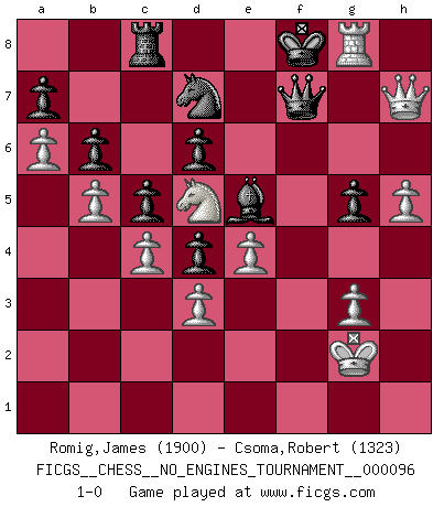 Last move : 1-0 2018 January 25 19:11:26 [Event "FICGS__CHESS__NO_ENGINES_TOURNAMENT__000096"] [Site "FICGS"] [Date "2018.01.16"] [Round "1"] [White "Romig,James"] [Black "Csoma,Robert"] [Result "1-0"] [WhiteElo "1900"] [BlackElo "1323"] 1.c4 Nf6 2.Nf3 g6 3.g3 Bg7 4.Bg2 O-O 5.O-O c5 6.d3 d6 7.Nc3 Nc6 8.Bd2 Bd7 9.a3 Qc8 10.Rb1 Bh3 11.b4 Bxg2 12.Kxg2 Qd7 13.b5 Nd8 14.a4 e5 15.a5 Ne6 16.h3 Nd4 17.e4 Qd8 18.a6 b6 19.Nxd4 exd4 20.Ne2 Nd7 21.Nf4 Ne5 22.Qe2 Qd7 23.Nd5 Qd8 24.f4 Nd7 25.f5 Be5 26.h4 Kg7 27.fxg6 hxg6 28.h5 g5 29.Rf5 f6 30.Rbf1 Rc8 31.Qf3 Qe8 32.Qg4 Kh7 33.Bxg5 fxg5 34.Rxf8 Nxf8 35.Rf6 Nd7 36.Qf5+ Kh8 37.Rh6+ Kg8 38.Qh7+ Kf8 39.Rg6 Qf7 40.Rg8+ 1-0 English Opening Kingside Castling by player Black (move 4) Kingside Castling by player White (move 5) Player White won this chess game. Follow this game move after move (download)One of these modest little moves may be more embarrassing to your opponent than the biggest threat. (Siegbert Tarrasch) Schach ist mein Leben, meine Leidenschaft, was ich gelernt habe und seit meinem 14. Lebensjahr profimässig praktiziere. Darauf zu verzichten, würde mir sehr schwer fallen. (Viktor Kortschnoi) Combinaciones deslumbrantes son para la mayoría, mover madera es para los pocos. (Georg Kieninger) A ce moment-là, je menaçais de comprendre la position ! (Clément L'Heureux) Just because you do not take an interest in politics doesn't mean politics won't take an interest in you. (Pericles 430 B.C.)