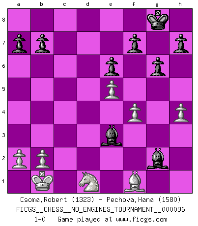 Last move : 1-0 2018 July 5 13:58:56 [Event "FICGS__CHESS__NO_ENGINES_TOURNAMENT__000096"] [Site "FICGS"] [Date "2018.01.16"] [Round "1"] [White "Csoma,Robert"] [Black "Pechova,Hana"] [Result "1-0"] [WhiteElo "1323"] [BlackElo "1580"] 1.Nf3 Nf6 2.c4 c5 3.Nc3 Nc6 4.d4 cxd4 5.Nxd4 e6 6.Ndb5 d5 7.cxd5 Nxd5 8.e4 Nxc3 9.Nxc3 Qxd1+ 10.Kxd1 Bc5 11.f3 O-O 12.Bd2 Rd8 13.Ke1 Bd7 14.Be2 Nd4 15.Rc1 Rac8 16.e5 Bc6 17.Rf1 Nf5 18.Bg5 Ne3 19.Bxd8 Nxg2+ 20.Kd1 Rxd8+ 21.Kc2 Ne3+ 22.Kb1 Nxf1 23.Rxf1 Rd2 24.f4 g6 25.h4 Bg2 26.Rd1 Be3 27.Bf1 Rxd1+ 28.Nxd1 1-0 This chess game has been lost on time (started : 2018.01.16 13:55:15) Reti Opening Kingside Castling by player Black (move 11) Player White won this chess game. Follow this game move after move (download)White lost because he failed to remember the right continuation and had to think up the moves himself. (Siegbert Tarrasch) Kein Schachspieler kann gut schlafen. (H. G. Wells) La mitad de las variaciones que son calculadas en una partida de torneo, resultan ser completamente superfluas. Desafortunadamente, nadie sabe por adelantado cual mitad. (Jan Tinman) Les échecs sont un jeu terrible. Si vous n'avez pas le centre, votre adversaire a une position plus libre. Par contre, si vous avez le centre, alors vous avez vraiment quelque chose pour laquelle vous inquiéter ! (Siegbert Tarrasch) God is an atheist. (Unknown)