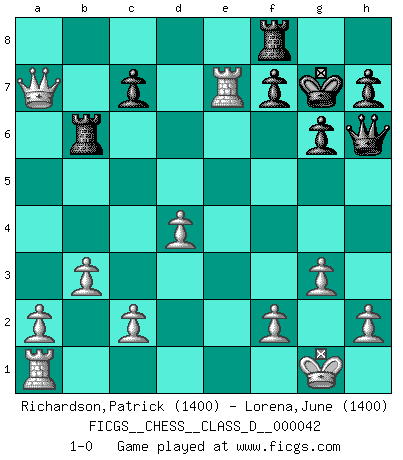 Last move : 1-0 2007 August 25 11:32:27 [Event "FICGS__CHESS__CLASS_D__000042"] [Site "FICGS"] [Date "2007.04.21"] [Round "1"] [White "Richardson,Patrick"] [Black "Lorena,June"] [Result "1-0"] [WhiteElo "1400"] [BlackElo "1400"] 1.e4 e5 2.Nf3 Nc6 3.Bb5 a6 4.Bxc6 bxc6 5.Nxe5 Nf6 6.d4 Be7 7.Nc3 O-O 8.O-O d5 9.Re1 dxe4 10.Nxe4 Nxe4 11.Rxe4 Bg5 12.Nxc6 Qf6 13.Bxg5 Qxg5 14.Ne7+ Kh8 15.Nxc8 Raxc8 16.Re5 Qf4 17.g3 Qh6 18.Qe2 g6 19.Qxa6 Rb8 20.b3 Kg7 21.Re7 Rb6 22.Qa7 1-0 This chess game has been lost on time (started : 2007.04.21 15:18:42) Ruy Lopez : Exchange variation Kingside Castling by player Black (move 7) Kingside Castling by player White (move 8) Player White won this chess game. Follow this game move after move (download)Morphy was probably the greatest genius of them all. (Bobby Fischer) Das Schachspiel übertrifft alle anderen Spiele so weit wie der Chimborasso einen Misthaufen. (Arthur Schopenhauer) Siempre es mejor sacrificar los hombres de tu oponente. (Savielly Tartakower) Le jeu d'échecs fait naître et fortifie en nous plusieurs qualités précieuses dans le cours de l'existence, telles que la prévoyance, la circonspection, la prudence, et la persévérance. (Benjamin Franklin - 1783, la morale des échecs) If everyone is thinking alike, then somebody isn't thinking. (US General George S. Patton)