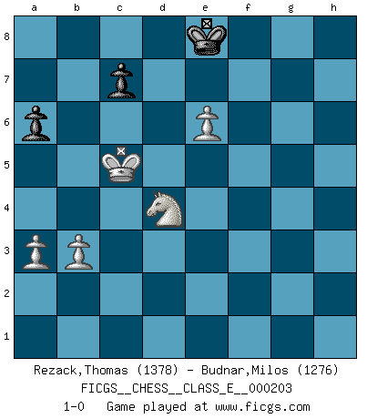 Last move : 1-0 2018 March 23 20:1:10 [Event "FICGS__CHESS__CLASS_E__000203"] [Site "FICGS"] [Date "2018.01.16"] [Round "1"] [White "Rezack,Thomas"] [Black "Budnar,Milos"] [Result "1-0"] [WhiteElo "1378"] [BlackElo "1276"] 1.e4 e5 2.Nf3 Nc6 3.Bb5 a6 4.Bc4 Bc5 5.c3 d6 6.d4 exd4 7.cxd4 Bb4+ 8.Nc3 Nf6 9.O-O O-O 10.e5 dxe5 11.dxe5 Qxd1 12.Nxd1 Ng4 13.a3 Bc5 14.Bf4 Be6 15.Rc1 Bxc4 16.Rxc4 b6 17.Bg3 h5 18.h3 Na5 19.Rxc5 bxc5 20.hxg4 hxg4 21.Nh2 Rad8 22.Nxg4 Rd7 23.Nge3 Rb8 24.Re1 Nb3 25.Nc4 Nc1 26.Nc3 Nd3 27.Rb1 Rb3 28.Ne4 Rd4 29.Ned2 Rb8 30.b3 Kf8 31.Rd1 Rd7 32.Kf1 g6 33.Ke2 g5 34.Na5 Rbd8 35.Ne4 Nf4+ 36.Bxf4 Rxd1 37.Bxg5 Rd8d4 38.Nc6 Rxe4+ 39.Kxd1 Rg4 40.Be7+ Ke8 41.Bxc5 Rxg2 42.Kd2 Rg6 43.Nd4 Rg5 44.f4 Rg2+ 45.Kd3 Rg3+ 46.Kc4 Kd7 47.f5 Rg4 48.e6+ fxe6 49.fxe6+ Ke8 50.Kd5 Rg5+ 51.Kc6 Rxc5+ 52.Kxc5 1-0 Ruy Lopez (Spanish Opening) Kingside Castling by player White (move 9) Kingside Castling by player Black (move 9) 10 pieces endgame at move 49 : White KBNPPP , Black KRPP WHITE : King + 1 Bishop 1 Knight 3 Pawns BLACK : King + 1 Rook 2 Pawns 9 pieces endgame at move 51 : White KNPPP , Black KRPP WHITE : King + 1 Knight 3 Pawns BLACK : King + 1 Rook 2 Pawns 8 pieces endgame at move 52 : White KNPPP , Black KPP WHITE : King + 1 Knight 3 Pawns BLACK : King + 2 Pawns Player White won this chess game. Follow this game move after move (download)My style is somewhere between that of Tal and Petrosian. (Reshevsky) Die Partien sind immer verschieden, die Interviews immer die gleichen. (Garry Kasparov) El hombre es un frívolo, una creatura engañosa y como un jugador de Ajedrez, se preocupa mas por el proceso de obtener su meta que de la meta por sí misma. (Dostoyevsky) Les ravages du H expliquent la différence de niveau entre Tal et Thal [Abergel]. Everybody lies. (Gregory House, House M.D.)