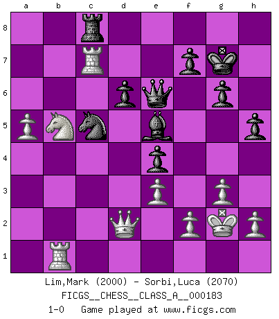 Last move : 1-0 2018 September 30 0:16:33 [Event "FICGS__CHESS__CLASS_A__000183"] [Site "FICGS"] [Date "2018.01.17"] [Round "1"] [White "Lim,Mark"] [Black "Sorbi,Luca"] [Result "1-0"] [WhiteElo "2000"] [BlackElo "2070"] 1.d4 Nf6 2.Nf3 g6 3.e3 Bg7 4.Be2 O-O 5.O-O d6 6.c4 Nbd7 7.Nc3 e5 8.b4 Re8 9.a4 e4 10.Ne1 Nf8 11.a5 a6 12.b5 axb5 13.cxb5 Ne6 14.Bd2 c5 15.bxc6 bxc6 16.Qa4 c5 17.Nc2 Re7 18.Rfb1 Rea7 19.Nb5 Bd7 20.Qa2 Bxb5 21.Rxb5 Ne8 22.Qb2 N8c7 23.Rb6 Nd5 24.Rb3 Rc8 25.Rb7 Ndf4 26.Rxa7 Nxe2+ 27.Kf1 cxd4 28.Qb7 Qe8 29.Rb1 d3 30.Nb4 Nc5 31.Qd5 Nc3 32.Bxc3 Bxc3 33.Nc6 Bf6 34.g3 Kg7 35.Nd4 Be5 36.Nb5 d2 37.Qxd2 Qe6 38.Kg2 h5 39.Rc7 1-0 King's Indian : East Indian defense Kingside Castling by player Black (move 4) Kingside Castling by player White (move 5) Player White won this chess game. Follow this game move after move (download)Chess is a part of culture and if a culture is declining then Chess too will decline. (Mikhail Botvinnik) Jeder Fehler erscheint unglaublich dumm, wenn andre ihn begehen. (Georg Christoph Lichtenberg) Tu eres para mi la Reina en d8 y yo soy el Peón en d7!!. (GM Eduard Gufeld) Pour se monter efficace, un Cavalier a besoin d'avant-postes ! Les Cavaliers font les meilleurs bloqueurs de pions passés. Lottery : A tax on people who are bad at math. (Author unknown)