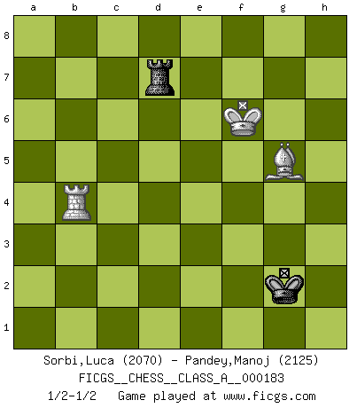Last move : 1/2-1/2 2019 February 3 5:8:15 [Event "FICGS__CHESS__CLASS_A__000183"] [Site "FICGS"] [Date "2018.01.17"] [Round "1"] [White "Sorbi,Luca"] [Black "Pandey,Manoj"] [Result "1/2-1/2"] [WhiteElo "2070"] [BlackElo "2125"] 1.e4 c5 2.Nf3 Nc6 3.d4 cxd4 4.Nxd4 e5 5.Nb5 d6 6.N1c3 a6 7.Na3 b5 8.Nd5 Nce7 9.c4 Nxd5 10.exd5 bxc4 11.Nxc4 Nf6 12.Be3 Be7 13.Be2 Rb8 14.a4 Bb7 15.Nb6 O-O 16.O-O Qe8 17.a5 Bd8 18.Bc4 h6 19.Ra3 Kh8 20.f3 Kg8 21.b4 Kh8 22.f4 exf4 23.Bxf4 Qe4 24.Qd3 Bxb6+ 25.axb6 Rfd8 26.Qxe4 Nxe4 27.Bxa6 Nf6 28.b5 Nxd5 29.Bg3 Kg8 30.Rd3 Nb4 31.Rxd6 Nxa6 32.bxa6 Bxa6 33.Rxd8+ Rxd8 34.Ra1 Bb7 35.Ra7 Rd1+ 36.Kf2 Rd2+ 37.Ke1 Rd7 38.Kf2 Rd2+ 39.Ke3 Rd7 40.Bc7 Bxg2 41.b7 Bxb7 42.Rxb7 Kh7 43.Ke4 Kg6 44.Rb6+ Kg5 45.Bd6 Kg4 46.Rb4 g5 47.Ke5 Kh3 48.Bf8 Kxh2 49.Bxh6 f6+ 50.Kxf6 Kg2 51.Bxg5 1/2-1/2 Comment by player 2 : Manoj Pandey : just about any commonsense move gives a tablebase draw: try eg https://www.shredderchess.com/online-chess/online-databases/endgame-database.html. Position is: 8/3r4/5K1B/6p1/1R6/8/7k/8 b - - 0 50 Even 50. ... Kg2 (which I'll play) is a draw; even after 51. Bxg5. Sicilian : Labourdonnais-Loewenthal (Kalashnikov) variation Kingside Castling by player Black (move 15) Kingside Castling by player White (move 16) 10 pieces endgame at move 41 : White KRBP , Black KRBPPP WHITE : King + 1 Rook 1 Bishop 1 Pawn BLACK : King + 1 Rook 1 Bishop 3 Pawns 9 pieces endgame at move 42 : White KRBP , Black KRPPP WHITE : King + 1 Rook 1 Bishop 1 Pawn BLACK : King + 1 Rook 3 Pawns 8 pieces endgame at move 48 : White KRB , Black KRPPP WHITE : King + 1 Rook 1 Bishop BLACK : King + 1 Rook 3 Pawns 7 pieces endgame at move 49 : White KRB , Black KRPP WHITE : King + 1 Rook 1 Bishop BLACK : King + 1 Rook 2 Pawns 6 pieces endgame at move 50 : White KRB , Black KRP WHITE : King + 1 Rook 1 Bishop BLACK : King + 1 Rook 1 Pawn 5 pieces endgame at move 51 : White KRB , Black KR WHITE : King + 1 Rook 1 Bishop BLACK : King + 1 Rook This chess game ended in a draw. Follow this game move after move (download)When you see a good move, look for a better one. (Emanuel Lasker) Es gibt zwei Arten von Opfern: Korrekte und meine. (Mikhail Nekhemyevich Tal) Sin errores no puede haber brillantez. (Emanuel Lasker) Avant la finale, les dieux ont créé le milieu de partie. (Tarrasch) A good book on your shelf is a friend that turns its back on you and remains a friend. (Author unknown)