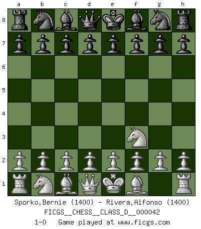 Last move : 1-0 2007 June 6 6:25:56 [Event "FICGS__CHESS__CLASS_D__000042"] [Site "FICGS"] [Date "2007.04.21"] [Round "1"] [White "Sporko,Bernie"] [Black "Rivera,Alfonso"] [Result "1-0"] [WhiteElo "1400"] [BlackElo "1400"] 1.Nf3 1-0 This chess game has been lost on time (started : 2007.04.21 15:18:42) Reti Opening Player White won this chess game. Follow this game move after move (download)For surely of all the drugs in the world, Chess must be the most permanently pleasurable. (Assiac) Der Traum, für den ich lebe, ist der von einem freien Russland. Viele mögen sagen: Russland hat doch ein Parlament, einen gewählten Präsidenten. Aber ich spüre, dass in meiner Heimat die Angst wiederkehrt. Eine Angst, sich frei zu äußern, bestimmte Dinge zu tun (Garry Kasparov) Yo jugué Ajedrez con el y a veces le pude haber ganado solo que siempre devuelve su última jugada y juega la partida de manera diferente. (Mark Twain) Plusieurs personnes se sont demandées comment Tal faisait pour gagner... En fait, c'est très simple ! Il met ses pièces au centre de l'échiquier et les sacrifie quelque part ! (David Bronstein) Vladimir Ras-Putin is still alive... He is also a good actor, I saw him in the Lord of the Rings. (Rodolfo d'Ettorre)