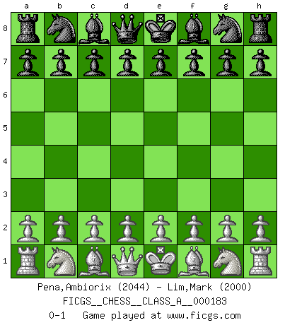 Last move : 0-1 2018 February 27 3:34:55 [Event "FICGS__CHESS__CLASS_A__000183"] [Site "FICGS"] [Date "2018.01.17"] [Round "1"] [White "Pena,Ambiorix"] [Black "Lim,Mark"] [Result "0-1"] [WhiteElo "2044"] [BlackElo "2000"] 0-1 This chess game has been lost on time (started : 2018.01.17 23:3:4) Player Black won this chess game. Follow this game move after move (download)Morphy was probably the greatest genius of them all. (Bobby Fischer) Wenn ich gewinne bin ich ein Genie. Wenn nicht, dann bin ich keines. (Robert James Fischer) No es suficiente ser un buen jugador, se debe también de jugar bién. (Siegbert Tarrasch) Le jeu d'échecs fait naître et fortifie en nous plusieurs qualités précieuses dans le cours de l'existence, telles que la prévoyance, la circonspection, la prudence, et la persévérance. (Benjamin Franklin - 1783, la morale des échecs) You have to believe in yourself. (Sun Tzu)