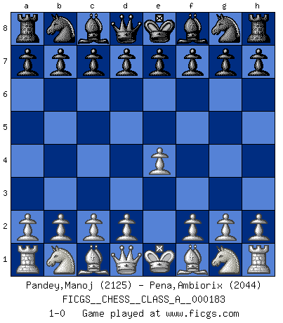 Last move : 1-0 2018 February 27 15:34:35 [Event "FICGS__CHESS__CLASS_A__000183"] [Site "FICGS"] [Date "2018.01.17"] [Round "1"] [White "Pandey,Manoj"] [Black "Pena,Ambiorix"] [Result "1-0"] [WhiteElo "2125"] [BlackElo "2044"] 1.e4 1-0 This chess game has been lost on time (started : 2018.01.17 23:3:4) King's pawn Opening Player White won this chess game. Follow this game move after move (download)Bobby is the finest Chess player this country ever produced. His memory for the moves, his brilliance in dreaming up combinations, and his fierce determination to win are uncanny. (John Collins) Schon mancher Spieler hat aufgegeben, um zu vermeiden, daß er eine Figur verliert. (Savielly Grigorievitsch Tartakower) En el Ajedrez, tal como en la vida, las bendiciones de hoy pueden ser el veneno del mañana. (Assaic) Les Echecs mettent en conflit, non pas deux intelligences, mais deux volontés. (Lasker) Don't be irreplaceable, if you can't be replaced, you can't be promoted. (Dan Rotaru)