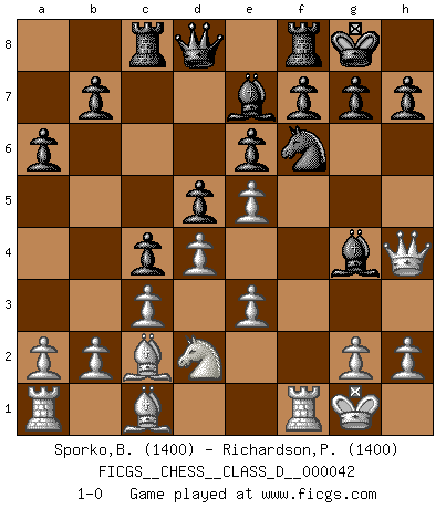 Last move : 1-0 2007 June 3 15:33:33 [Event "FICGS__CHESS__CLASS_D__000042"] [Site "FICGS"] [Date "2007.04.21"] [Round "1"] [White "Sporko,Bernie"] [Black "Richardson,Patrick"] [Result "1-0"] [WhiteElo "1400"] [BlackElo "1400"] 1.d4 Nf6 2.e3 d5 3.Bd3 c5 4.c3 Nc6 5.f4 Bg4 6.Nf3 e6 7.O-O Be7 8.Nbd2 O-O 9.Qe1 c4 10.Bc2 a6 11.Ne5 Rc8 12.Qh4 Nxe5 13.fxe5 1-0 Queen's pawn game Kingside Castling by player White (move 7) Kingside Castling by player Black (move 8) Player White won this chess game. Follow this game move after move (download)For me, Chess is life and every game is like a new life. Every Chess player gets to live many lives in one lifetime. (Eduard Gufeld) Das Schachspiel ist ein See, in welchem eine Mücke baden und ein Elefant ertrinken kann. (Emanuel Lasker) Observen a Garry Kasparov. Después de una derrota, invariablemente el gana la próxima partida. Prácticamente hace pedazos a su siguiente oponente. Eso es algo que tenemos que aprender a lograr. (Maurice Ashley) Le plus grand jeu de l'esprit jamais inventé, plus vous l'apprenez, plus vous y prenez du plaisir. (Garry Kasparov) If you are good, you will be assigned all the work. If you are really good, you will get out of it. (Dan Rotaru)