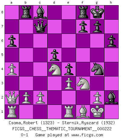 Last move : 0-1 2018 February 15 18:56:6 [Event "FICGS__CHESS__THEMATIC_TOURNAMENT__000222"] [Site "FICGS"] [Date "2018.01.18"] [Round "1"] [White "Csoma,Robert"] [Black "Sternik,Ryszard"] [Result "0-1"] [WhiteElo "1323"] [BlackElo "1932"] 1.e4 c5 2.Nf3 a6 3.d4 cxd4 4.Nxd4 e6 5.Be2 Nf6 6.e5 Qa5+ 7.Nc3 Qxe5 8.Nf3 Qc7 9.O-O d5 10.Be3 b5 11.a4 b4 12.Nb1 Bd6 13.Nbd2 Ng4 14.Bg5 Bxh2+ 15.Kh1 h6 16.Be3 Nxe3 17.fxe3 Bg3 18.Nb3 Nd7 19.Nbd4 Nf6 20.Qd2 Ne4 21.Qxb4 Rb8 22.Qa3 Bd6 23.Qa2 O-O 24.Rfe1 e5 25.Nb3 Nf2+ 26.Kg1 Ng4 27.Bf1 e4 28.Nbd4 Bh2+ 0-1 Sicilian : O'Kelly variation Kingside Castling by player White (move 9) Kingside Castling by player Black (move 23) Player Black won this chess game. Follow this game move after move (download)We like to think. (Gary Kasparov) Wer wird heute Abend ihr Gegner sein? -- Heute Abend spiele ich gegen die schwarzen Steine. (Akiba Rubinstein) En el Ajedrez, tal como en la vida, las bendiciones de hoy pueden ser el veneno del mañana. (Assaic) Mais l'homme est une créature légère et illogique : semblable au joueur d'échecs, il n'aime que le processus du but à atteindre, non le but lui-même. (Dostoïevsky) Always be a first-rate version of yourself, instead of a second-rate version of somebody else. (Judy Garland)