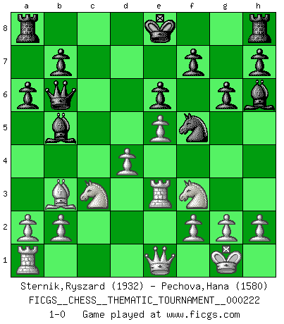 Last move : 1-0 2018 May 30 12:32:23 [Event "FICGS__CHESS__THEMATIC_TOURNAMENT__000222"] [Site "FICGS"] [Date "2018.01.18"] [Round "1"] [White "Sternik,Ryszard"] [Black "Pechova,Hana"] [Result "1-0"] [WhiteElo "1932"] [BlackElo "1580"] 1.e4 c5 2.Nf3 a6 3.c3 e6 4.d4 d5 5.e5 Nc6 6.Bd3 Bd7 7.O-O cxd4 8.cxd4 Qb6 9.Bc2 Nb4 10.Bb3 Bb5 11.Re1 Nd3 12.Re3 Nxc1 13.Qxc1 g6 14.Nc3 Bh6 15.Bxd5 Ne7 16.Bb3 Nf5 17.Qe1 1-0 This chess game has been lost on time (started : 2018.01.18 0:30:2) Sicilian : O'Kelly variation Kingside Castling by player White (move 7) Player White won this chess game. Follow this game move after move (download)Everything is in a state of flux, and this includes the world of Chess. (Mikhail Botvinnik) Ich brauche nur einen Blick auf das Schachbrett zu werfen, und weiß schon, was in der Stellung steckt, was geschehen kann und was geschehen wird. Alle übrigen suchen und prüfen, ich aber weiß es! (José Raúl Capablanca) En manos de Fischer's, una diminuta ventaja teórica es tan buena como tener una Reina de ventaja. (Isaac Kashdan) Vous n'êtes pas toujours obligé de jouer le meilleur coup. Un coup doit être actif, entreprenant, correct et beau ! (David Bronstein) All war is based on deception. (Sun Tzu)