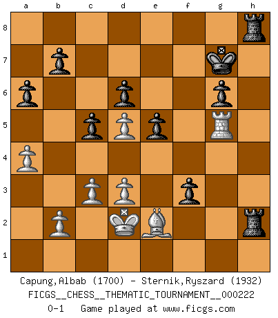 Last move : 0-1 2018 February 4 16:48:16 [Event "FICGS__CHESS__THEMATIC_TOURNAMENT__000222"] [Site "FICGS"] [Date "2018.01.18"] [Round "1"] [White "Capung,Albab"] [Black "Sternik,Ryszard"] [Result "0-1"] [WhiteElo "1700"] [BlackElo "1932"] 1.e4 c5 2.Nf3 a6 3.a3 d6 4.Be2 Nf6 5.Nc3 e5 6.d3 Be7 7.O-O O-O 8.Ng5 h6 9.Nh3 Nc6 10.Nd5 Bxh3 11.gxh3 Nxd5 12.exd5 Nd4 13.Bh5 Bg5 14.f4 Bxf4 15.c3 Qg5+ 16.Qg4 Ne2+ 17.Kf2 Nxc1 18.Qxg5 hxg5 19.Raxc1 Bxc1 20.Rxc1 g6 21.Be2 Kg7 22.Rg1 Rh8 23.Bg4 f5 24.Be2 Rxh3 25.Rxg5 Rxh2+ 26.Ke3 Rah8 27.a4 f4+ 28.Kd2 f3 0-1 Sicilian : O'Kelly variation Kingside Castling by player White (move 7) Kingside Castling by player Black (move 7) Player Black won this chess game. Follow this game move after move (download)I give 98 percent of my mental energy to Chess. Others give only 2 percent. (Bobby Fischer) Alles was am Schachbrett zählt sind gute Züge. (Robert James Fischer) Diferente gente reacciona diferentemente en aceptar la derrota. (Bobby Fischer) Mais n'est-ce pas déjà le limiter injurieusement que d'appeler les échecs un jeu? N'est-ce pas aussi une science, un art, ou quelque chose qui, comme le cercueil de Mahomet entre ciel et terre, est suspendu entre l'un et l'autre, et qui réunit un nombre incroyable de contraires ? (Stefan Zweig) After growing wildly for years, the field of computing appears to be reaching its infancy. (John Pierce)
