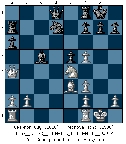 Last move : 1-0 2018 June 15 2:50:44 [Event "FICGS__CHESS__THEMATIC_TOURNAMENT__000222"] [Site "FICGS"] [Date "2018.01.18"] [Round "1"] [White "Cesbron,Guy"] [Black "Pechova,Hana"] [Result "1-0"] [WhiteElo "1810"] [BlackElo "1580"] 1.e4 c5 2.Nf3 a6 3.c4 Nc6 4.d4 cxd4 5.Nxd4 Nf6 6.Nc3 e5 7.Nf5 d5 8.cxd5 Bxf5 9.exf5 Nd4 10.Bd3 Be7 11.O-O Nxd5 12.Be4 Nf6 13.Bxb7 Ra7 14.Qa4+ Nd7 15.Bf3 O-O 16.Be3 Nxf3+ 17.gxf3 Bc5 18.Ne4 1-0 This chess game has been lost on time (started : 2018.01.18 0:30:2) Sicilian : O'Kelly variation Kingside Castling by player White (move 11) Kingside Castling by player Black (move 15) Player White won this chess game. Follow this game move after move (download)Capture of the adverse King is the ultimate but not the first object of the game. (William Steinitz) Schach ist Krieg, im Schach geht es um testosterongesteuerte Urschreie. (Garry Kasparov) Peones: ellos son el alma de esta partida, solos forman el ataque y la defensa. (Philidor) Il a essayé de se convaincre qu'il pourrait empêcher toutes les erreurs et ne jamais perdre. L'horreur ! Gary Kasparov au sujet de Robert Fischer. A woman without a man is like a fish without a bicycle. (Gloria Steinem)