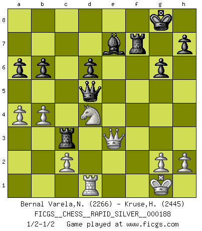 Last move : 1/2-1/2 2018 February 7 21:8:22 [Event "FICGS__CHESS__RAPID_SILVER__000188"] [Site "FICGS"] [Date "2018.01.18"] [Round "2"] [White "Bernal Varela,Nelson"] [Black "Kruse,Herbert"] [Result "1/2-1/2"] [WhiteElo "2266"] [BlackElo "2445"] 1.e4 c5 2.Nf3 d6 3.d4 cxd4 4.Nxd4 Nf6 5.Nc3 a6 6.Bg5 e6 7.Qf3 Nbd7 8.Be2 Qc7 9.O-O Be7 10.a4 b6 11.Qg3 Bb7 12.Rfd1 O-O 13.Bh6 Ne8 14.Bf4 Bf6 15.Be3 Nc5 16.f3 Rc8 17.Qf2 Be5 18.f4 Bf6 19.Bf3 g6 20.b4 Nd7 21.Ra3 Be7 22.Rb3 Nef6 23.f5 Ne5 24.fxe6 Nfg4 25.Bxg4 Nxg4 26.Qg3 Nxe3 27.Qxe3 Qc4 28.exf7+ Rxf7 29.Nd5 Bxd5 30.exd5 Qxd5 31.Rc3 Rxc3 1/2-1/2 Sicilian : Najdorf, 6...e6 Kingside Castling by player White (move 9) Kingside Castling by player Black (move 12) This chess game ended in a draw. Follow this game move after move (download)Don't even mention losing to me. I can't stand to think of it. (Bobby Fischer) Ich glaube, ich kenne inzwischen die Gründe für mein Versagen: schachliche Charakterfehler. Ich war nie ein Wunderkind und in meiner gesamten menschlichen Entwicklung immer zu langsam. (Viktor Kortschnoi) Creo que una cierta cantidad de temperamento es esperada de los genios del Ajedrez. (Ron Gross) Le profane ne songe pas à la somme de jouissance dont il se prive, qui méconnaît ce jeu aux ressources aussi variées que passionnantes. (Jean-Marie Jeanton-Lamarche) Before all elsed, be armed. (Niccolo Machiavelli)