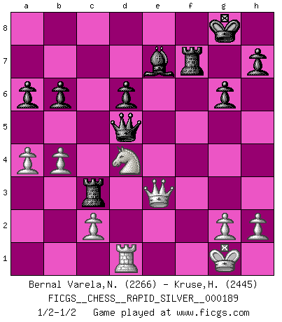 Last move : 1/2-1/2 2018 February 8 19:18:7 [Event "FICGS__CHESS__RAPID_SILVER__000189"] [Site "FICGS"] [Date "2018.01.18"] [Round "2"] [White "Bernal Varela,Nelson"] [Black "Kruse,Herbert"] [Result "1/2-1/2"] [WhiteElo "2266"] [BlackElo "2445"] 1.e4 c5 2.Nf3 d6 3.d4 cxd4 4.Nxd4 Nf6 5.Nc3 a6 6.Bg5 e6 7.Qf3 Nbd7 8.Be2 Qc7 9.O-O Be7 10.a4 b6 11.Qg3 Bb7 12.Rfd1 O-O 13.Bh6 Ne8 14.Bf4 Bf6 15.Be3 Nc5 16.f3 Rc8 17.Qf2 Be5 18.f4 Bf6 19.Bf3 g6 20.b4 Nd7 21.Ra3 Be7 22.Rb3 Nef6 23.f5 Ne5 24.fxe6 Nfg4 25.Bxg4 Nxg4 26.Qg3 Nxe3 27.Qxe3 Qc4 28.exf7+ Rxf7 29.Nd5 Bxd5 30.exd5 Qxd5 31.Rc3 Rxc3 1/2-1/2 Sicilian : Najdorf, 6...e6 Kingside Castling by player White (move 9) Kingside Castling by player Black (move 12) This chess game ended in a draw. Follow this game move after move (download)Chess is the gymnasium of the mind. (Blaise Pascal) Jeder Schachmeister war einmal ein Anfänger. (Irving Chernev) Una buena memoria, concentración, imaginación y una fuerte voluntad, se requiere para llegar a ser un buen jugador. (Bobby Fischer) Le système Elo représente seulement une moyenne. Il est simplement un indicateur de votre stabilité. (Anatoli Karpov) If everyone is thinking alike, then somebody isn't thinking. (US General George S. Patton)