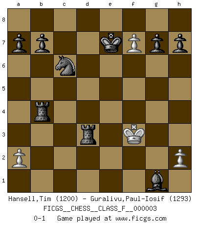 Last move : 0-1 2006 July 7 22:43:18 [Event "FICGS__CHESS__CLASS_F__000003"] [Site "FICGS"] [Date "2006.06.01"] [Round "1"] [White "Hansell,Tim"] [Black "Guralivu,Paul-Iosif"] [Result "0-1"] [WhiteElo "1200"] [BlackElo "1293"] 1.e4 c5 2.Nf3 Nc6 3.d4 cxd4 4.Bb5 Nf6 5.Bg5 Nxe4 6.c3 dxc3 7.Qd3 Nxg5 8.Nxc3 Nxf3+ 9.gxf3 e6 10.Rg1 d5 11.Rd1 Bd7 12.Qe3 Qe7 13.f4 d4 14.Qe4 dxc3 15.bxc3 Qh4 16.Rxd7 Kxd7 17.Qd3+ Bd6 18.c4 Qxf4 19.c5 Qc1+ 20.Qd1 Qxd1+ 21.Kxd1 Bxc5 22.Re1 Ke7 23.f4 Rad8+ 24.Ke2 Rd5 25.Rg1 Bxg1 26.f5 Rhd8 27.Kf3 Rxb5 28.fxe6 Rb4 29.exf7 Rd3+ 0-1 Sicilian defense Player Black won this chess game. Follow this game move after move (download)It is always better to sacrifice your opponent's men. (Savielly Tartakower) Ich bin der einzige Schachspieler, der sich während der Vorbereitungen zum Turnier verletzt hat. (Woody Allen) El Ajedrez es el juego mas altamente simbólico, pero las agresiones estan por lo tanto aún mas francamente representadas en la partida. Tal vez comenzo como un juego de guerra; Algo como la representación de una batalla en miniatura entre las fuerzas de dos reinos. (Karl Meninger) Votre prénom est 'Tactique', votre deuxième prénom est 'Tactique' et votre nom est 'Tactique'. (Ken Smith) When I took office, only high energy physicists had ever heard of what is called the World Wide Web... Now even my cat has its own page. (Bill Clinton, 1996)