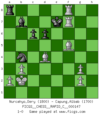 Last move : 1-0 2018 February 14 11:56:5 [Event "FICGS__CHESS__RAPID_C__000147"] [Site "FICGS"] [Date "2018.01.18"] [Round "1"] [White "Nurcahyo,Dery"] [Black "Capung,Albab"] [Result "1-0"] [WhiteElo "1800"] [BlackElo "1700"] 1.e4 e6 2.c3 Qf6 3.d4 Qg6 4.Bf4 Qxe4+ 5.Ne2 Na6 6.Nd2 Qc6 7.Nf3 h6 8.Ng3 g6 9.Ne5 Qb6 10.b3 d6 11.Nc4 Qc6 12.Qd3 Bg7 13.Na5 Qd5 14.Nc4 b5 15.Ne3 Qc6 16.Nc2 e5 17.Bd2 Bb7 18.dxe5 Bxe5 19.O-O-O Ne7 20.Qxb5 Nc5 21.Qxc6+ Bxc6 22.Nb4 Bxg3 23.hxg3 Bb7 24.Kb2 Ne4 25.Be1 a5 26.Bb5+ c6 27.Bd3 Nxf2 28.Bxf2 axb4 29.cxb4 O-O 30.Rxh6 Nd5 31.Bd4 f6 32.Rdh1 Nxb4 33.Rxg6+ Kf7 34.Rxf6+ Ke7 35.Rh7+ Rf7 36.Rhxf7+ Ke8 37.Rf8+ Kd7 38.Bf5+ Ke7 39.R6f7+ 1-0 French defense Queenside Castling by player White (move 19) Kingside Castling by player Black (move 29) Player White won this chess game. Follow this game move after move (download)Fischer is completely natural. He plays no roles. He's like a child. Very, very simple. (Zita Rajcsanyi) Ein Springer auf f6 gegen die eigene Rochadestellung ist schlimmer als ein rostiger Nagel im Knie. (Efim Bogoljubov) El Ajedrez es una guerra en un tablero. El objetivo es aplastar la mente del oponente. (Bobby Fischer) Les échecs, c'est l'imagination. (David Bronstein) Political correctness is subjecting us to gross incompetence. (Johann Piek)