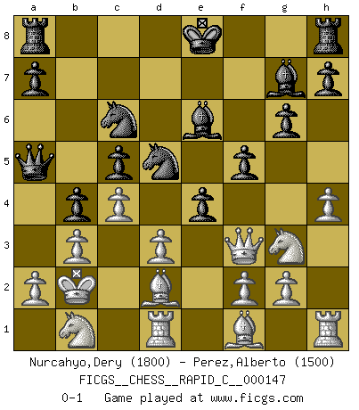 Last move : 0-1 2018 January 28 18:14:42 [Event "FICGS__CHESS__RAPID_C__000147"] [Site "FICGS"] [Date "2018.01.18"] [Round "1"] [White "Nurcahyo,Dery"] [Black "Perez,Alberto"] [Result "0-1"] [WhiteElo "1800"] [BlackElo "1500"] 1.e4 c5 2.Ne2 Nc6 3.c3 Nf6 4.d3 d5 5.exd5 Nxd5 6.Na3 e5 7.Ng3 f5 8.Qf3 g6 9.h4 Bg7 10.Bg5 Nde7 11.O-O-O Be6 12.b3 Qa5 13.Kb2 Nd5 14.Bd2 b5 15.Nb1 b4 16.c4 e4 0-1 Sicilian : Keres variation (2.Ne2) Queenside Castling by player White (move 11) Player Black won this chess game. Follow this game move after move (download)Dazzling combinations are for the many, shifting wood is for the few. (Georg Kieninger) Ich tröste mich mit dem Vergnügen, daß Schachfans, Zuschauer und Leser glücklich sind, wenn ein Großmeister etwas riskiert, statt nur Klötzchen zu schieben. (Mikhail Nekhemyevich Tal) Un jugador que trata de regresar una movida en el Ajedrez es un futuro carterista. (Richard Fenton) C'est une question de caractère, Beaucoup de gens perdent leur motivation très vite. D'autres, ils sont rares, peuvent la conserver très longtemps. J'aime les échecs, encore aujourd'hui je suis heureux d'analyser des parties. J'aime toujours gagner, je déteste encore perdre. Bien jouer est important pour mon intégrité intellectuelle et morale. Et puis les échecs vivent en ce moment une période historique grâce à Internet. Ils se développent dans les systèmes éducatifs à travers le monde. Ils sortent de leur ghetto, et c'est mon rôle de mener à bien cette révolution. (Gary Kasparov) When a man with money meets a man with experience, the man with experience leaves with money and the man with money leaves with experience. (Anonymous)