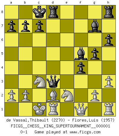 Last move : 0-1 2018 January 29 22:57:41 [Event "FICGS__CHESS__KING_SUPERTOURNAMENT__000001"] [Site "FICGS"] [Date "2018.01.18"] [Round "1"] [White "de Vassal,Thibault"] [Black "Flores,Luis"] [Result "0-1"] [WhiteElo "2270"] [BlackElo "1957"] 1.e4 e5 2.f4 exf4 3.Bc4 d5 4.Bxd5 Nf6 5.Nc3 Nxd5 6.Nxd5 g5 7.Qh5 Be6 8.Nc3 h6 9.d3 Qd7 10.h3 Nc6 11.Bd2 Bg7 12.Nge2 O-O-O 13.O-O-O f5 14.exf5 Bxf5 15.Qf3 Ne5 16.Qf1 Nxd3+ 17.cxd3 Qxd3 0-1 KGA : Bishop's gambit, Morphy variation Queenside Castling by player Black (move 12) Queenside Castling by player White (move 13) Player Black won this chess game. Follow this game move after move (download)Only sissies Castle. (Rob Sillars) Über Kasparov: Es ist offensichtlich, daß er in einem totalitären Staat aufwuchs und deshalb zu diktatorischen Zügen neigt. (Viktor Kortschnoi) Por tratar de evitar la pérdida de una pieza, muchas personas han perdido una partida de Ajedrez. (Savielly Tartakover) Il n'y a pas eu de défaite parce que je ne crois pas que cet ordinateur ait jamais existé. IBM a triché en refusant d'imprimer les modes de recherche de la machine. C'est évident, pendant le match, des coups décisifs ont été joués par des êtres humains. Aujourd'hui, les meilleurs spécialistes en informatique ne peuvent toujours pas expliquer comment Deep-Blue a pu jouer contre la logique des ordinateurs. IBM a gagné une guerre de communication, mais ils sont incapables de prouver que l'ordinateur a gagné tout seul. (Garry Kasparov) They say poker is a zero-sum game. It must be, because every time I play my sum ends up zero. (Max Shapiro)