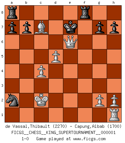 Last move : 1-0 2018 January 24 6:21:20 [Event "FICGS__CHESS__KING_SUPERTOURNAMENT__000001"] [Site "FICGS"] [Date "2018.01.18"] [Round "1"] [White "de Vassal,Thibault"] [Black "Capung,Albab"] [Result "1-0"] [WhiteElo "2270"] [BlackElo "1700"] 1.e4 e5 2.f4 exf4 3.Bc4 Qh4+ 4.Kf1 Bc5 5.d4 Bb6 6.Nf3 Qg4 7.Bxf7+ Kxf7 8.Ne5+ Kf8 9.Nxg4 d5 10.exd5 Ne7 11.c4 Na6 12.Bxf4 Bxg4 13.Qxg4 Bxd4 14.Nc3 Ke8 15.Re1 Rf8 16.Ke2 Nc5 17.Bxc7 Bxc3 18.bxc3 Na4 19.Kd1 Nxc3+ 20.Kc2 Nxa2 21.Rxe7+ Kxe7 22.Qe6+ 1-0 KGA : Bishop's gambit, Greco variation Player White won this chess game. Follow this game move after move (download)Suddenly it was obvious to me in my analysis I had missed what Fischer had found with the greatest of ease at the board. (Mikhail Botvinnik) Intelligenz läßt sich nicht am Weg, sondern nur am Ergebnis feststellen. (Garry Kasparov) Si tu oponente no puede hacer nada activo, entonces no apures la posición; En vez de eso, dejalo estar sentado ahí, sufriendo y rogandote por un empate. (Jeremy Silman) Les pièces de l'échiquier étaient impitoyables. Elles le retenaient, elles l'absorbaient. Il y avait de l'horreur en cela, mais aussi une harmonie unique. Car, qu'y a-t-il dans le monde, à part les échecs ? (V. Nabokov) Thus, what is of supreme importance in war is to attack the enemy's strategy. (Sun Tzu)