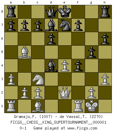 Last move : 0-1 2018 March 6 16:39:20 [Event "FICGS__CHESS__KING_SUPERTOURNAMENT__000001"] [Site "FICGS"] [Date "2018.01.18"] [Round "1"] [White "Gramajo,Francisco"] [Black "de Vassal,Thibault"] [Result "0-1"] [WhiteElo "1007"] [BlackElo "2270"] 1.e4 e5 2.f4 exf4 3.Nf3 g5 4.Nc3 d6 5.d4 Bg7 6.h3 Nc6 7.Bb5 Bd7 8.a3 h6 9.O-O Nge7 10.Qe2 Nxd4 11.Nxd4 Bxd4+ 0-1 This chess game has been lost on time (started : 2018.01.18 21:28:44) KGA : Quaade gambit Kingside Castling by player White (move 9) Player Black won this chess game. Follow this game move after move (download)A thorough understanding of the typical mating continuations makes the most complicated sacrificial combinations leading up to them not only not difficult, but almost a matter of course. (Siegbert Tarrasch) Ich hatte Zahnschmerzen im ersten Spiel. In der zweiten Partie tat mir der Kopf weh. In der dritten war es eine Rheuma-Attacke und während der vierten fühlte ich mich nicht gut. Und in der fünften? Nun, man muss doch nicht jedes Spiel gewinnen, oder? (Savielly Grigorievitsch Tartakower) No hay precio que sea tan grande por la cabellera del Rey enemigo. (Koblentz) Le génie consiste à savoir transgresser les règles au moment opportun. (Teichmann) The project of the man are lower than those of the sky. (Chinese proverb)