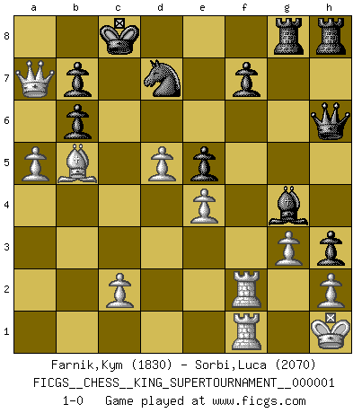 Last move : 1-0 2018 April 4 11:39:35 [Event "FICGS__CHESS__KING_SUPERTOURNAMENT__000001"] [Site "FICGS"] [Date "2018.01.18"] [Round "1"] [White "Farnik,Kym"] [Black "Sorbi,Luca"] [Result "1-0"] [WhiteElo "1830"] [BlackElo "2070"] 1.e4 e5 2.f4 exf4 3.Nf3 g5 4.d4 g4 5.Bxf4 gxf3 6.Qxf3 d6 7.Nc3 Nc6 8.Bb5 Qh4+ 9.Bg3 Qg4 10.Qf2 Bd7 11.O-O Bg7 12.Rad1 O-O-O 13.d5 Nb8 14.Be2 Qg6 15.Qxa7 h5 16.Bd3 Be5 17.Bxe5 dxe5 18.a4 Nf6 19.a5 Rdg8 20.Rd2 Qh6 21.Re2 Ne8 22.b4 h4 23.b5 h3 24.g3 Nd6 25.Ref2 Bg4 26.Kh1 Nd7 27.b6 cxb6 28.Nb5 Nxb5 29.Bxb5 1-0 KGA : Rosentreter gambit Kingside Castling by player White (move 11) Queenside Castling by player Black (move 12) Player White won this chess game. Follow this game move after move (download)Fischer is the strongest player in the world. In fact, the strongest player who ever lived. (Larry Evans) Im Reiche der Wirklichkeit ist man nie so glücklich wie im Reiche der Gedanken. (Arthur Schopenhauer) Ayuda a tus piezas para que ellas te puedan ayudar. (Paul Morphy) La vérité est comme le meilleur coup aux échecs : elle existe, mais il faut la chercher. (Arturo Perez-Reverte) Now the reason the enlightened prince and the wise general conquer the enemy whenever they move and their achievements surpass those of ordinary men is foreknowledge. (Sun Tzu)