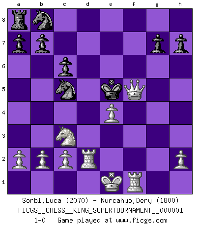 Last move : 1-0 2018 April 19 12:15:0 [Event "FICGS__CHESS__KING_SUPERTOURNAMENT__000001"] [Site "FICGS"] [Date "2018.01.18"] [Round "1"] [White "Sorbi,Luca"] [Black "Nurcahyo,Dery"] [Result "1-0"] [WhiteElo "2070"] [BlackElo "1800"] 1.e4 e5 2.f4 Qf6 3.Nf3 d6 4.fxe5 Qg6 5.Nc3 Bg4 6.Be2 Bxf3 7.Bxf3 dxe5 8.d4 Bd6 9.Bh5 Qxg2 10.Rf1 Nf6 11.Bxf7+ Kxf7 12.dxe5 Bxe5 13.Qd5+ Ke7 14.Qxe5+ Kd8 15.Bf4 c6 16.Qc7+ Ke8 17.Qc8+ Kf7 18.Qxh8 Nfd7 19.Be3 Ke7 20.Bc5+ Nxc5 21.Qf8+ Ke6 22.Qf7+ Kd6 23.Rd1+ Qd2+ 24.Rxd2+ Ke5 25.Qf5+ 1-0 KGD : Norwalde variation Player White won this chess game. Follow this game move after move (download)I have never in my life played the French Defence, which is the dullest of all openings. (Wilhelm Steinitz) Vom Schach wurde gesagt das Leben sei dafür nicht lange genug. Aber das ist der Fehler des Lebens, nicht des Schach'. (Irving Chernev) Durante una competencia de Ajedrez, un Maestro de Ajedrez deberá ser una combinación de presa de caza y un Monge. (Alexander Alekhine) Nous sommes les pions de la mystérieuse partie d'Echecs jouée par Dieu. Il nous déplace, nous arrête, nous pousse encore, puis nous lance un à un dans la boîte du Néant. Epitaphe sur la tombe de David Janowsky (1868-1927). Don't anthropomorphize computers - they hate it. (Anonymous)