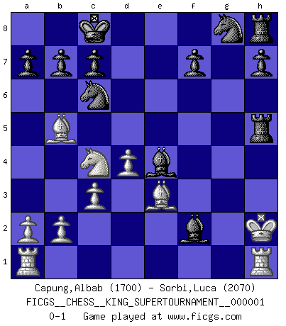 Last move : 0-1 2018 March 25 10:31:45 [Event "FICGS__CHESS__KING_SUPERTOURNAMENT__000001"] [Site "FICGS"] [Date "2018.01.18"] [Round "1"] [White "Capung,Albab"] [Black "Sorbi,Luca"] [Result "0-1"] [WhiteElo "1700"] [BlackElo "2070"] 1.e4 e5 2.f4 exf4 3.Nf3 g5 4.d4 g4 5.Ne5 Qh4+ 6.g3 fxg3 7.Qxg4 Qxg4 8.Nxg4 d5 9.Ne3 dxe4 10.hxg3 Nc6 11.c3 Bd6 12.Nf5 Bxf5 13.Bb5 O-O-O 14.Nd2 Bxg3+ 15.Kf1 e3 16.Nc4 Bd3+ 17.Kg1 Bf2+ 18.Kg2 Be4+ 19.Kh2 Rd5 20.Bxe3 Rh5+ 0-1 KGA : Soerensen gambit Queenside Castling by player Black (move 13) Player Black won this chess game. Follow this game move after move (download)I feel as if I were a piece in a game of Chess, when my opponent says of it: That piece cannot be moved. (Soren Kierkegaard) Kritik überlasse ich den Spießern. Ich zeige nichts, wofür ich mich schämen muss. (Alexandra Kosteniuk) El Ajedrez es un regaderazo frío para la mente. (Sir John Simon) On a dit que l'homme se distingue de l'animal par le fait qu'il achète plus de livres qu'il ne peut en lire. Je voudrais suggérer qu'inclure à la liste des livres quelques livres d'échecs rendrait la distinction manifeste. (Edward Lasker) If passion drives you, let reason holds the reins. (Benjamin Franklin)
