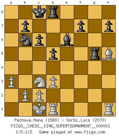 Last move : 1/2-1/2 2018 June 8 16:29:3 [Event "FICGS__CHESS__KING_SUPERTOURNAMENT__000001"] [Site "FICGS"] [Date "2018.01.18"] [Round "1"] [White "Pechova,Hana"] [Black "Sorbi,Luca"] [Result "1/2-1/2"] [WhiteElo "1580"] [BlackElo "2070"] 1.e4 e5 2.f4 exf4 3.Nf3 g5 4.h4 g4 5.Ne5 Nf6 6.Nxg4 Nxe4 7.d3 Ng3 8.Bxf4 Qe7+ 9.Be2 Rg8 10.Bxg3 Rxg4 11.Bf2 Rxg2 12.Nc3 d5 13.Qd2 c6 14.Be3 Be6 15.O-O-O Nd7 16.Bg5 Qb4 17.Qe3 Be7 18.Bh5 Bxg5 19.hxg5 O-O-O 20.Qxa7 Rxg5 21.a3 Qb6 22.Qxb6 Nxb6 1/2-1/2 KGA : Kieseritsky, Berlin defense Queenside Castling by player White (move 15) Queenside Castling by player Black (move 19) This chess game ended in a draw. Follow this game move after move (download)It is always better to sacrifice your opponent's men. (Savielly Tartakower) Aljechin war kein Nazi. Er war ein Opportunist. Ein schrecklicher Mann. Er liebte Geld über alles und würde für Geld ein Jude, ein Katolik oder ein Protestant werden. (Miguel Najdorf) Cada Peón es potencialmente una Reina. (James Mason) Les échecs sont un jeu terrible. Si vous n'avez pas le centre, votre adversaire a une position plus libre. Par contre, si vous avez le centre, alors vous avez vraiment quelque chose pour laquelle vous inquiéter ! (Siegbert Tarrasch) If we don't succeed, we run the risk of failure. (George W. Bush)